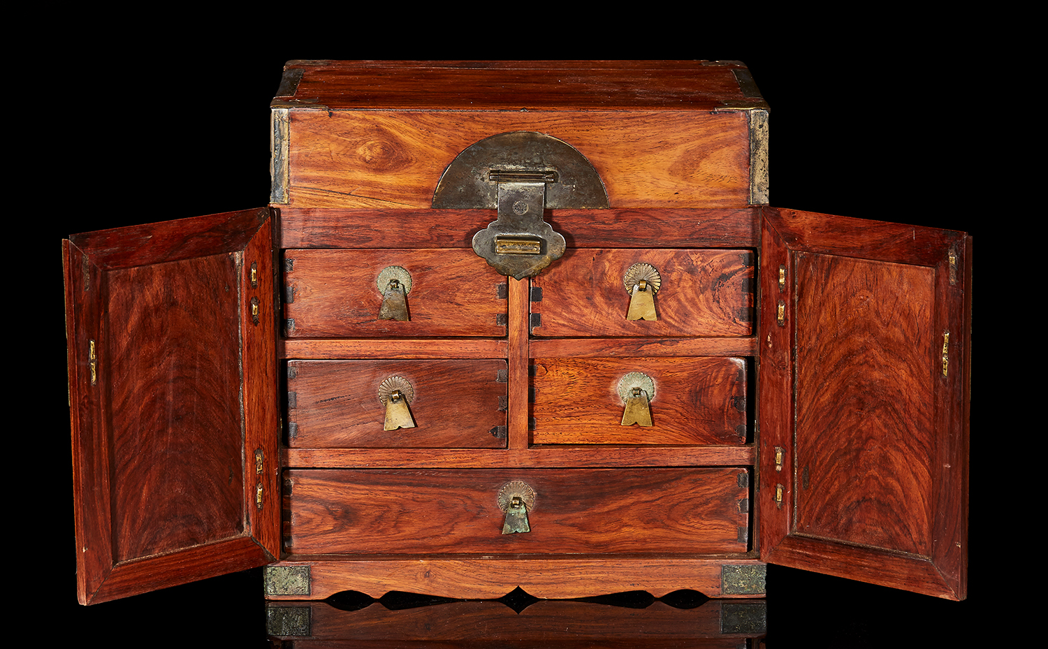 The beautiful yellow rosewood cabinet, of classical form, the lid lifting to reveal an inner tray and to release the two front rectangular doors, which in turn reveal the inner five drawers, all brass-mounted original fittings, with rectangular handles at the sides, and two 'hu' vase-form handles at the front, resting on a shallow base with a gentle cut-out scroll at the front, 33 width x 23 depth x 32cm height