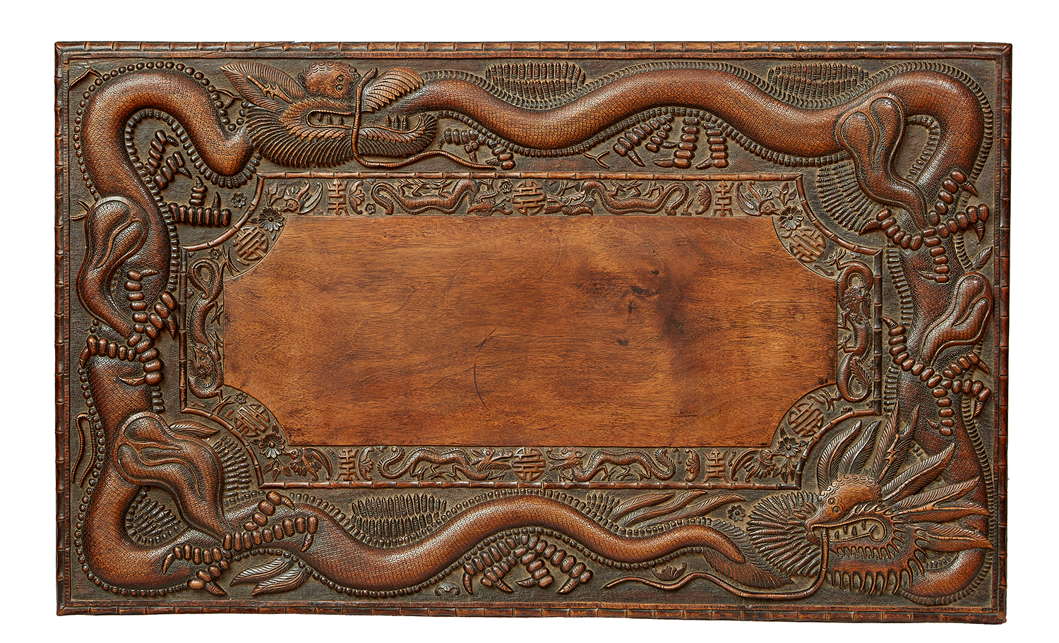Profusely carved and decorated with repeated dragons and other auspicious symbols, including the 'shou' medallion symbol for longevity, the 'chi' medallion of good fortune, and the 'xi' character for joy, together with imagery of deer and bats for good wishes, 100cm width x 61cm depth x 71cm high