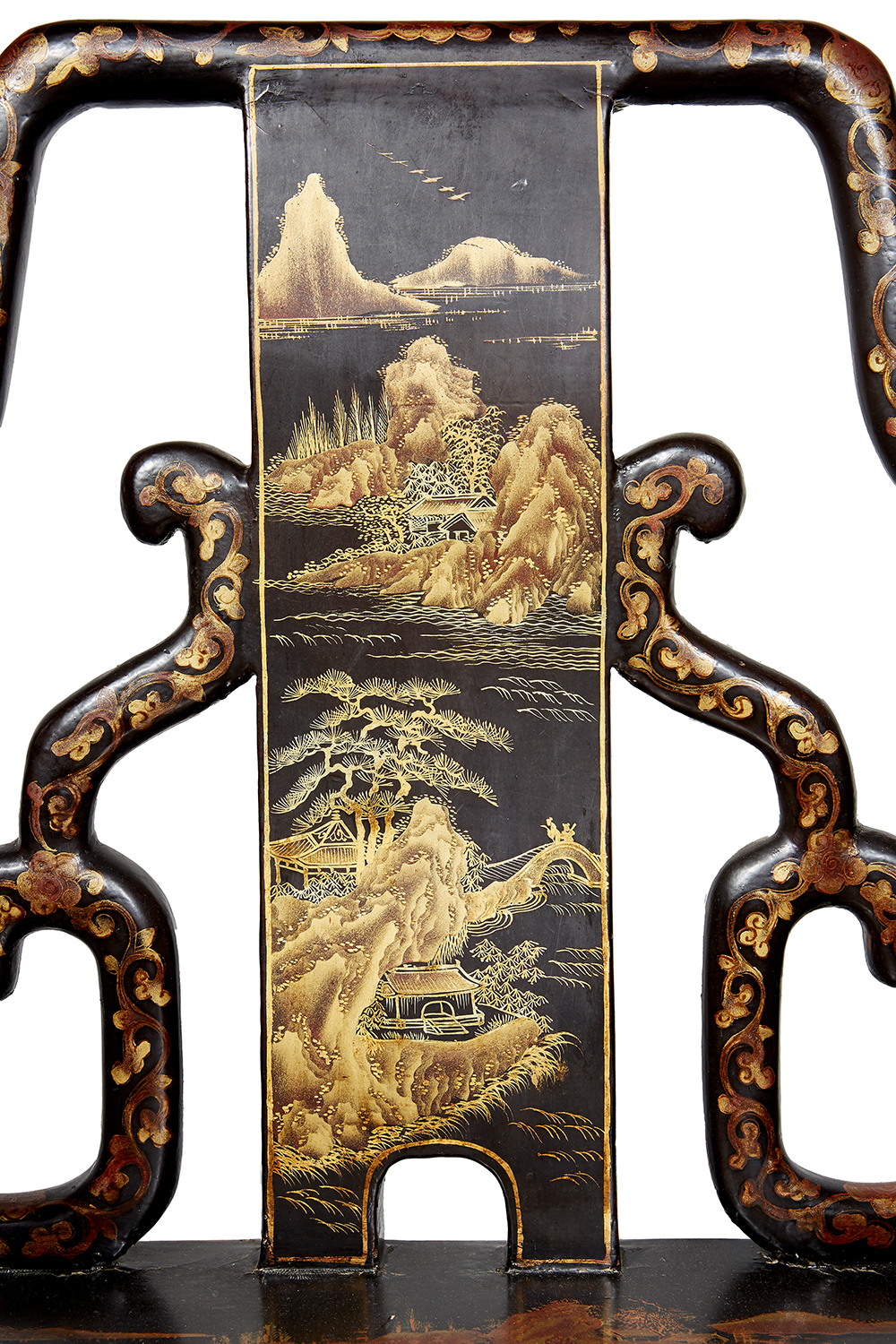 For a foreign market, the central back panels and seat decorated with a theme of pagodas in mystical mountains by river landscapes, with continuous floral design to the arms and legs, 56cm width x 46cm depth x 104cm height
