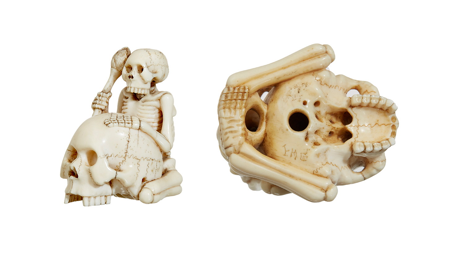 the first a netsuke in ivory of a kneeling skeleton with skull signed Asahi Gyokuzan; the second an ivory netsuke figure of a seated Buddhist monk with an alms bowl, rubbed signature, the tallest 8cm high