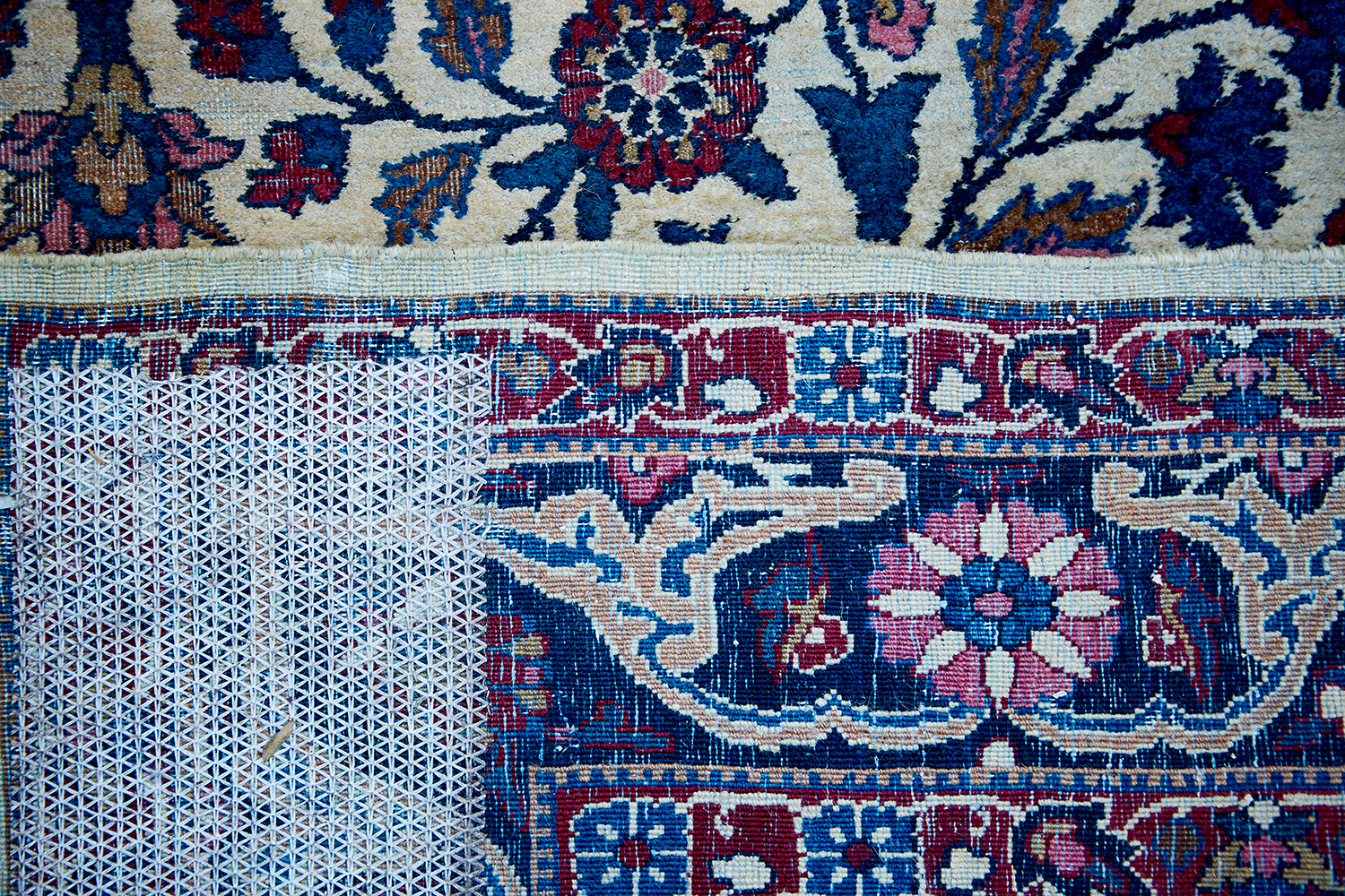 Displaying a central blue and red medallion on an ivory ground with blue spandrels to each corner, 226 length x 136cm width