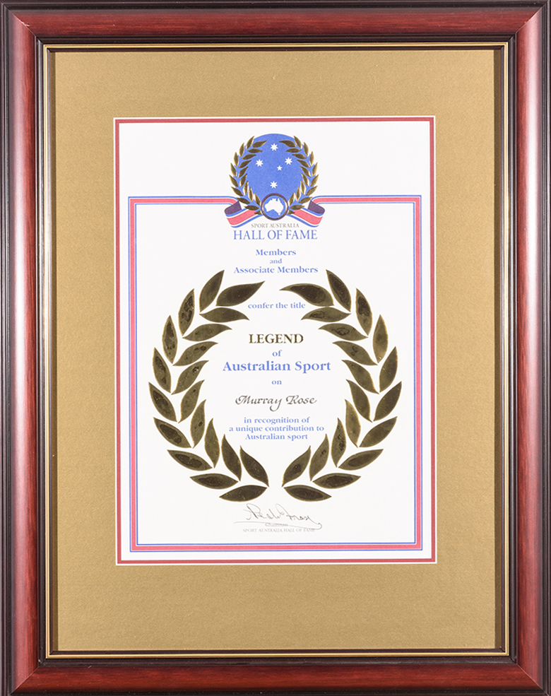 SPORT AUSTRALIA - HALL OF FAME: MURRAY ROSE'S MEDAL, MEMBER CERTIFICATES (2), LEGEND CERTIFICATE & BOOKLET.