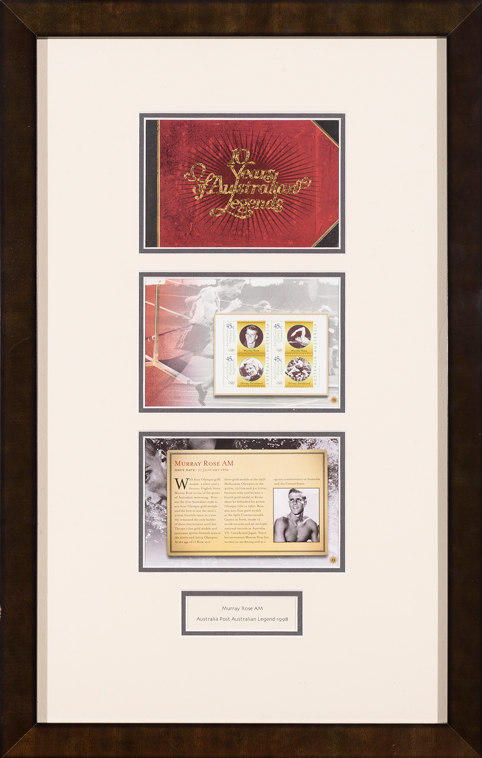 1998 AUSTRALIAN OLYMPIC LEGENDS STAMPS: AUSTRALIA POST DISPLAY BOX WITH TWO MURRAY ROSE STAMPS IN GOLD (SOME DISCOLOURATION); FRAMED BOOKLET DISPLAY; FDC'S (2) SIGNED HERB ELLIOTT, DAWN FRASER & MARJORIE JACKSON; PO PACK; MAXI CARDS & BOOKLET