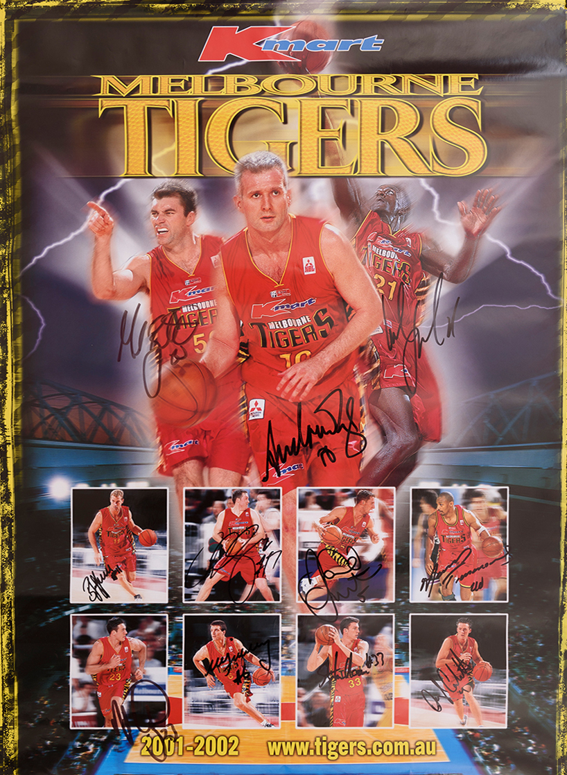 ANDREW GAZE: "SLAM DUNK" BASKETBALL BOARD GAME SIGNED BY ANDREW ON LID; PLUS MELBOURNE TIGERS POSTER WITH 11 SIGNATURES.