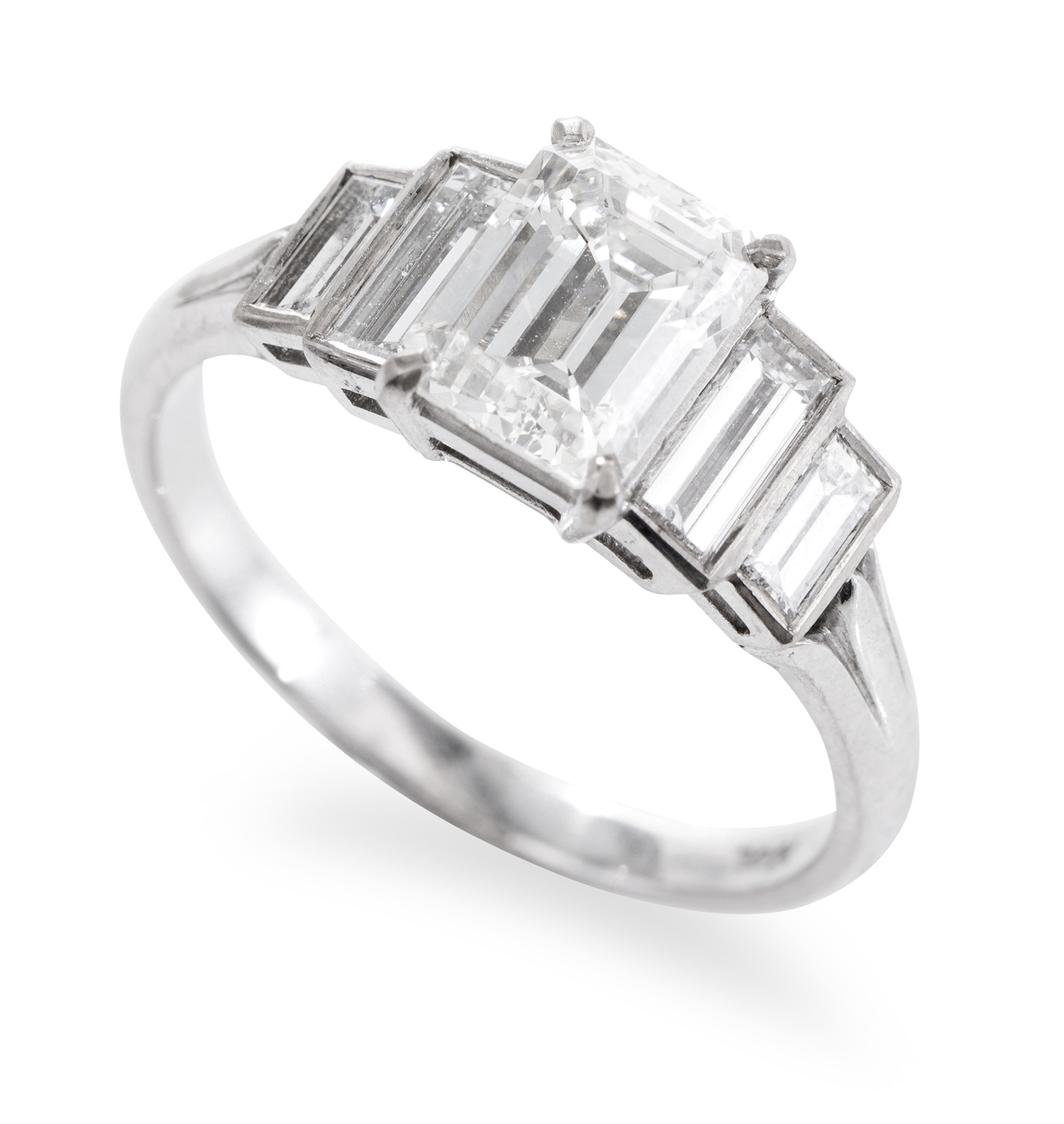 The centrally set emerald cut diamond of 1.46cts, with stepped baguette cut diamonds to the shoulders, mounted in 18ct white gold, ring size N.