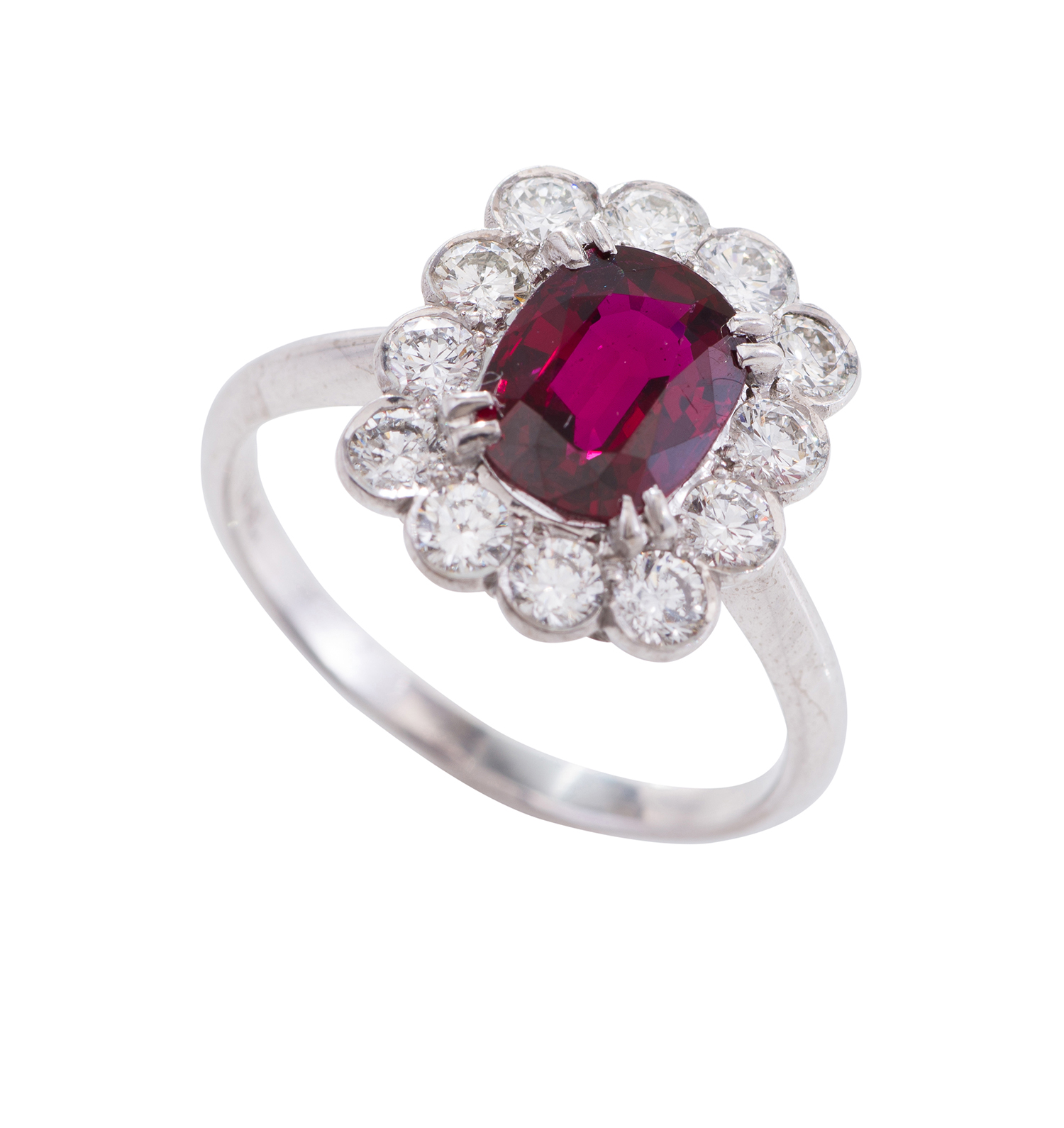 The oval cut ruby of 2.03cts surrounded by twelve round brilliant cut diamonds totalling 0.96cts, mounted in 18ct white gold, ring size M-N.