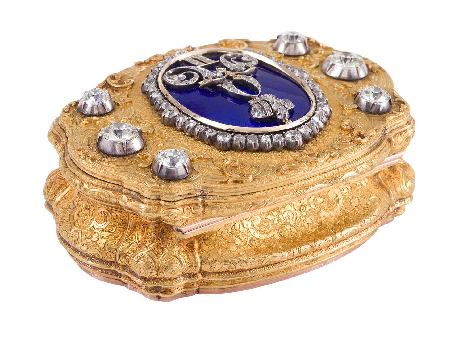 Hand crafted in gold, the ornately sculptured and engraved hinged box measuring 90 x 60 x 35mm, with raised and carved scrolled patterns to the lid , harlequin patterned blue enamel oval centre section and applied diamond set crown and initial "A II", surrounded by an oval border of mine cut diamonds, with six old European cut diamonds to the surround totalling 10.60cts, the repousse body finely hand engraved and the base also engraved with a scroll, leaf and floral design, the inner lip is stamped with the numbers 2378 and hand etched 27377, the base impressed mark 14 CMWS 2378, mark of Carl Martin Weishaupt und Söhne, Hanau, 157 grams, with original fitted presentation box.