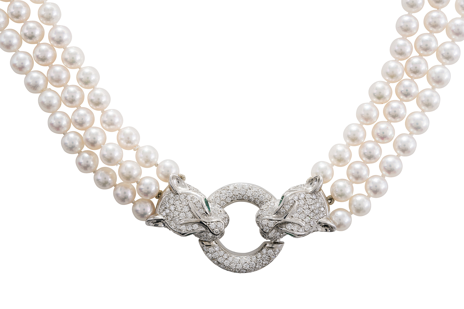 The triple strand of round pearls of pink and white hues measuring 6.10mm to 6.30mm, individually knotted to two diamond set leopard heads with emerald set eyes, joined by a circular pierced pave set diamond panel all in 18ct white gold, total length 470mm.