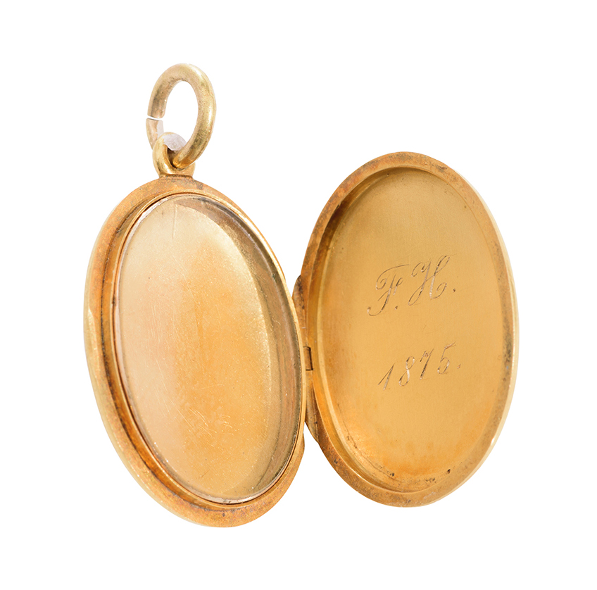 The hinged oval locket crafted in 15ct gold with polished finish. Engraved to the interior F.H. 1875.