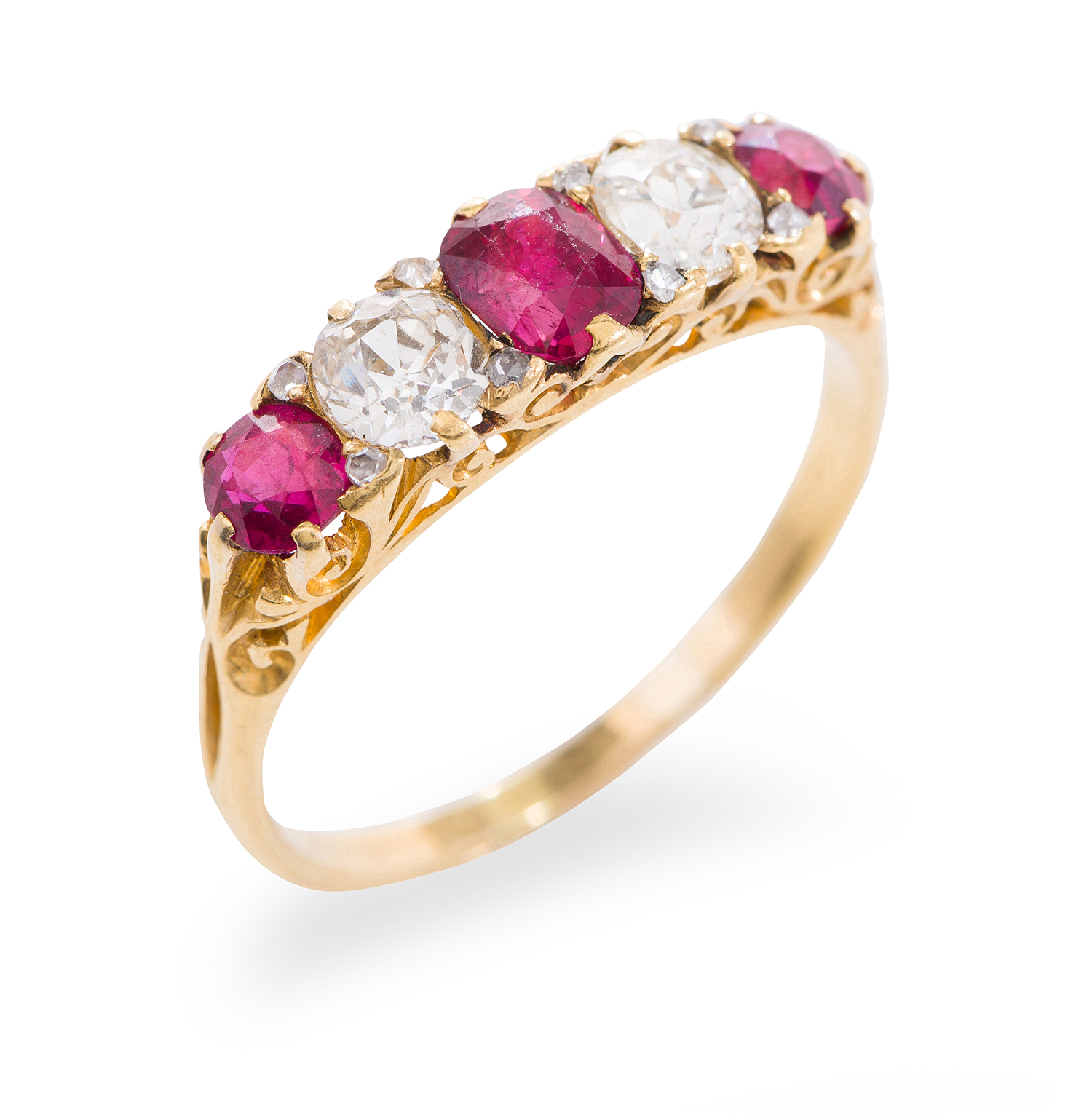 Comprising three oval cut rubies totalling 1.30cts, interspaced by two old European cut diamonds totalling 0.78cts, claw set in a hand carved scroll mount of 18ct gold, ring size R.