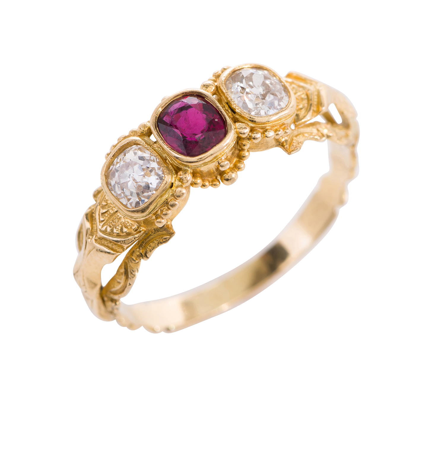 Centrally set with an oval cut ruby and two old European cut diamonds, totalling 0.42cts, having fine scroll work and beaded decoration throughout and finished with a finely carved and reeded band, mounted in 18ct gold, ring size L.