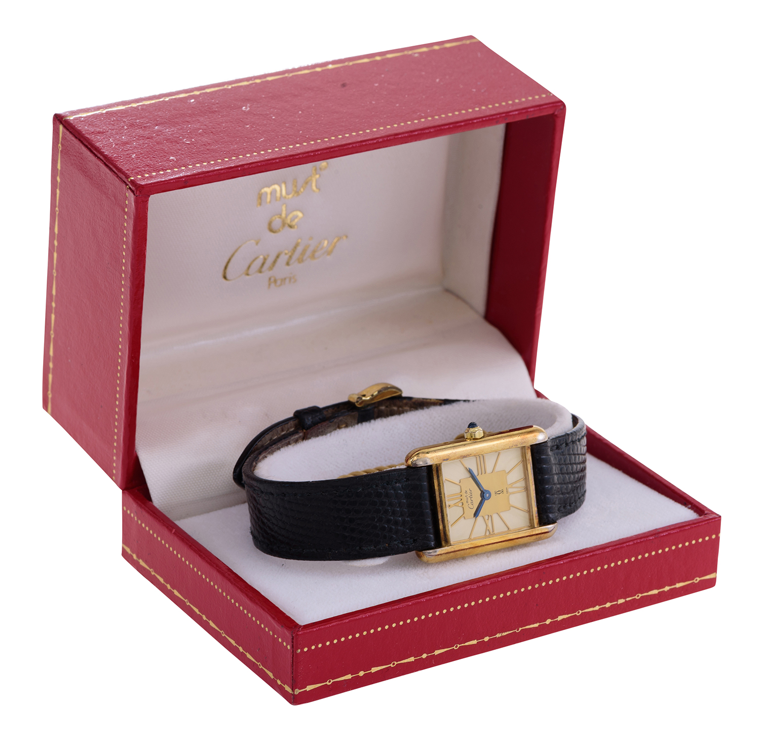 Quartz movement, rectangular cream dial with Roman numerals, signed case, dial and movement, gold plated silver case and black leather bands, case reference 366001 / 44788, case length 18mm, boxed with papers.