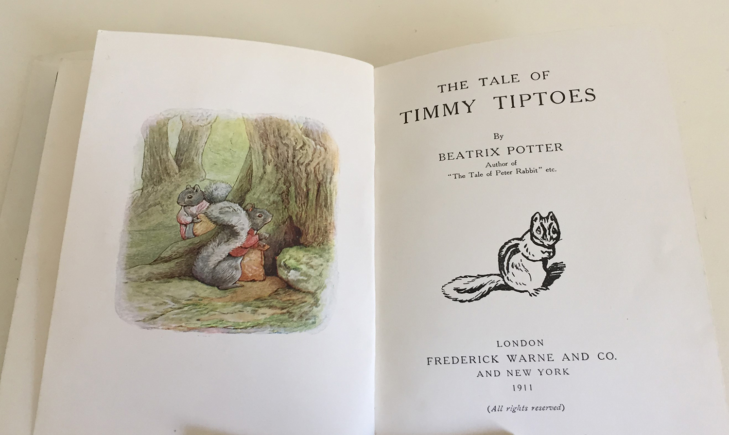 POTTER, Beatrix: A lovely first edition of Potter's: THE TALE OF TIMMY TIPTOES. demy 16mo, dark green papered boards, lettered in white, arch-shaped coloured illustration tipped to upper board, within an arch-shaped panel in blind. Frederick Warne & Co., 1911. (Quinby 20; Linder p. 429.)
