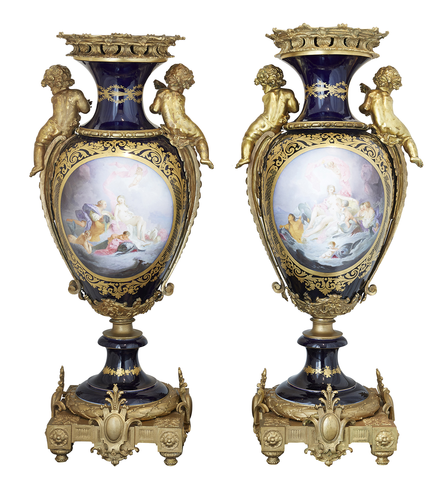 The porcelain in good condition with no faults. A museum conservator noted that the metal rods holding the components together need replacing to help stability. The gilt mounts with some wear consummate to age. The painted panels and tooled gilding all in good order, one Castle sene with minor scratch.
