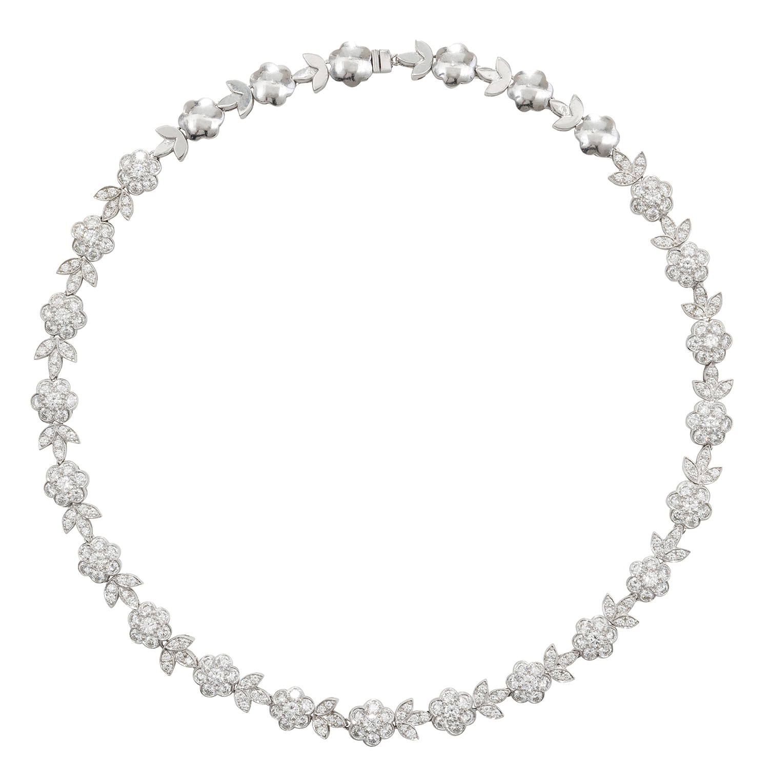 Of flower cluster and foliate design, comprising two hundred and forty seven round brilliant cut diamonds totalling 12.65cts, mounted in 18ct gold, total length 420mm, together with a pair of cubic zirconia drop earrings of a similar design.