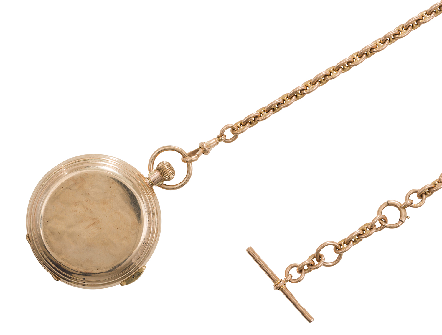 Crown wind lever set movement, circular white enamel dial with Roman numerals, subsidiary seconds dial at six, 9ct gold case, 50mm diameter, with associated 15ct gold gold anchor link fob chain with 'T' bar fitting, total length 450mm.