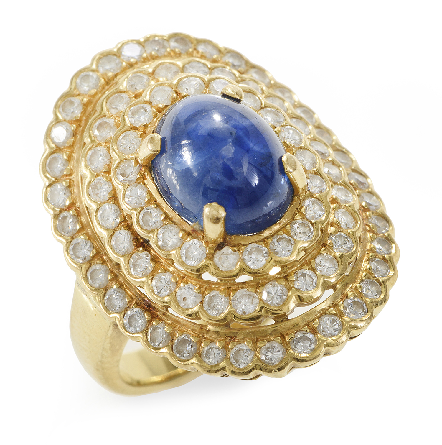 Comprising a necklace, bracelet and ring, each set with sapphires cut en cabochon, surrounded by round brilliant cut diamonds, accompanied by a matching pair of earrings set with white zircons, all mounted in 18ct gold.