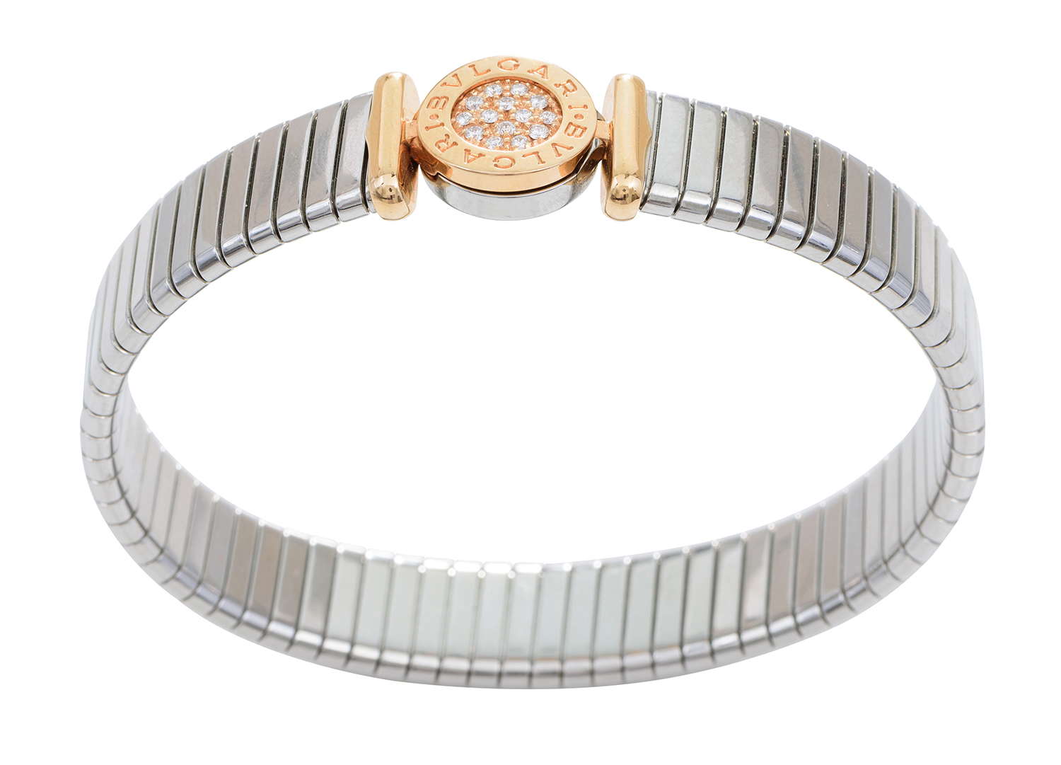 From the Tubogas collection, the stainless steel bracelet , having 18ct rose gold terminals and a diamond set clasp, total length 180mm, boxed.