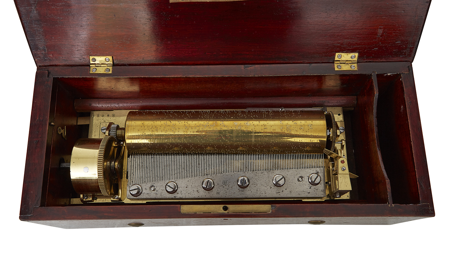 In good working order, wooden casing In good, Well polished condition. Underside of casing has handwritten number: 28098 in ink and repeated in pencil. Lock has not been checked, key missing. Complete with winder key. Item was lotted in a Christies auction. 5877 hand scratched on to side of cylinder. Cylinder measures 20.5cm approximately.