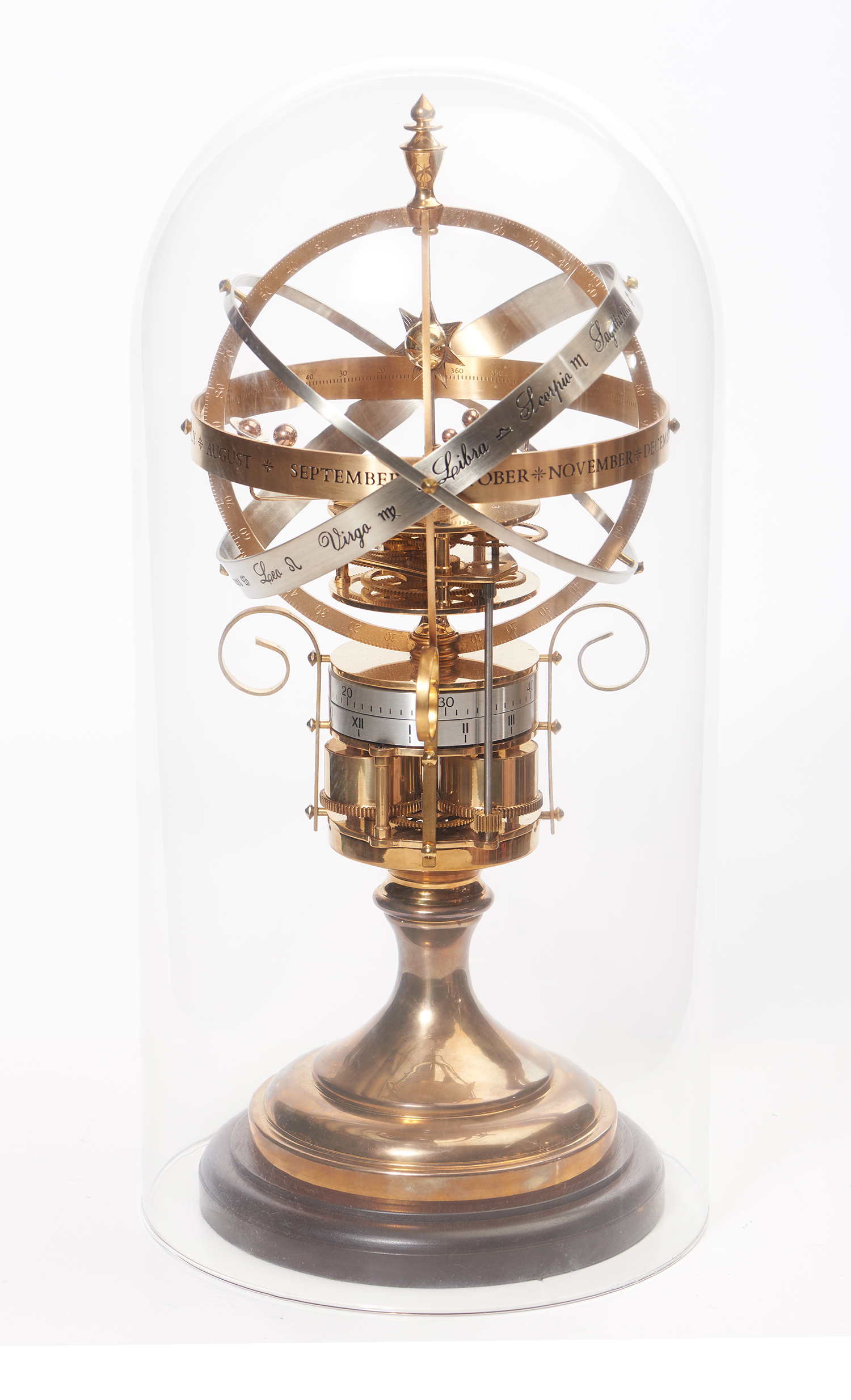 Mechanical spring driven orrery with dome. Gilt brass plates mounted on chalice base. Eight day going barrel movement with platform escapement, no. 907/1500