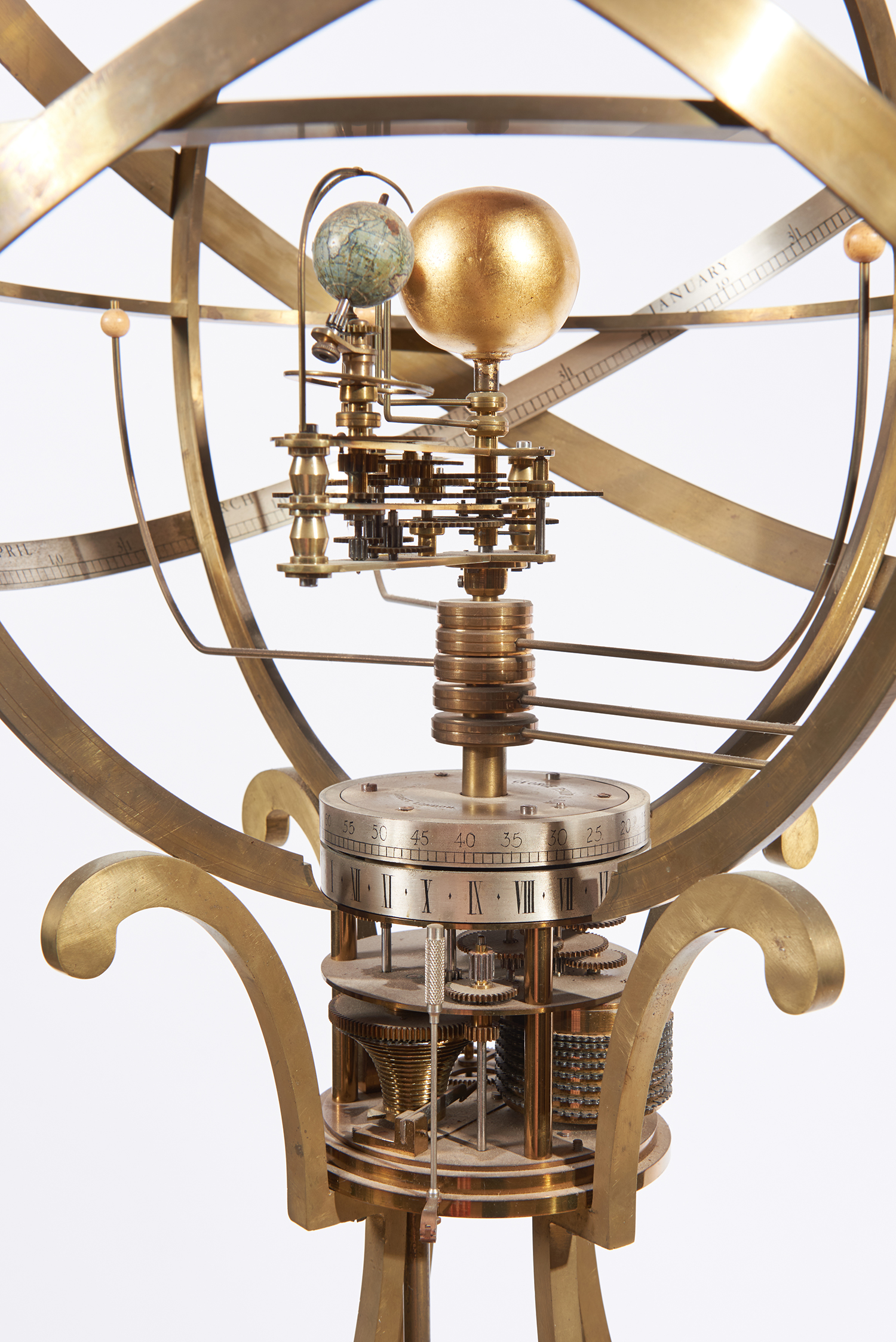 Orrery- dial re-silvered. All brass work tarnished/worn. working however not recently serviced or timed. Wooden planets replaced. sun re-gilded. Indicator for hour and minutes not original.