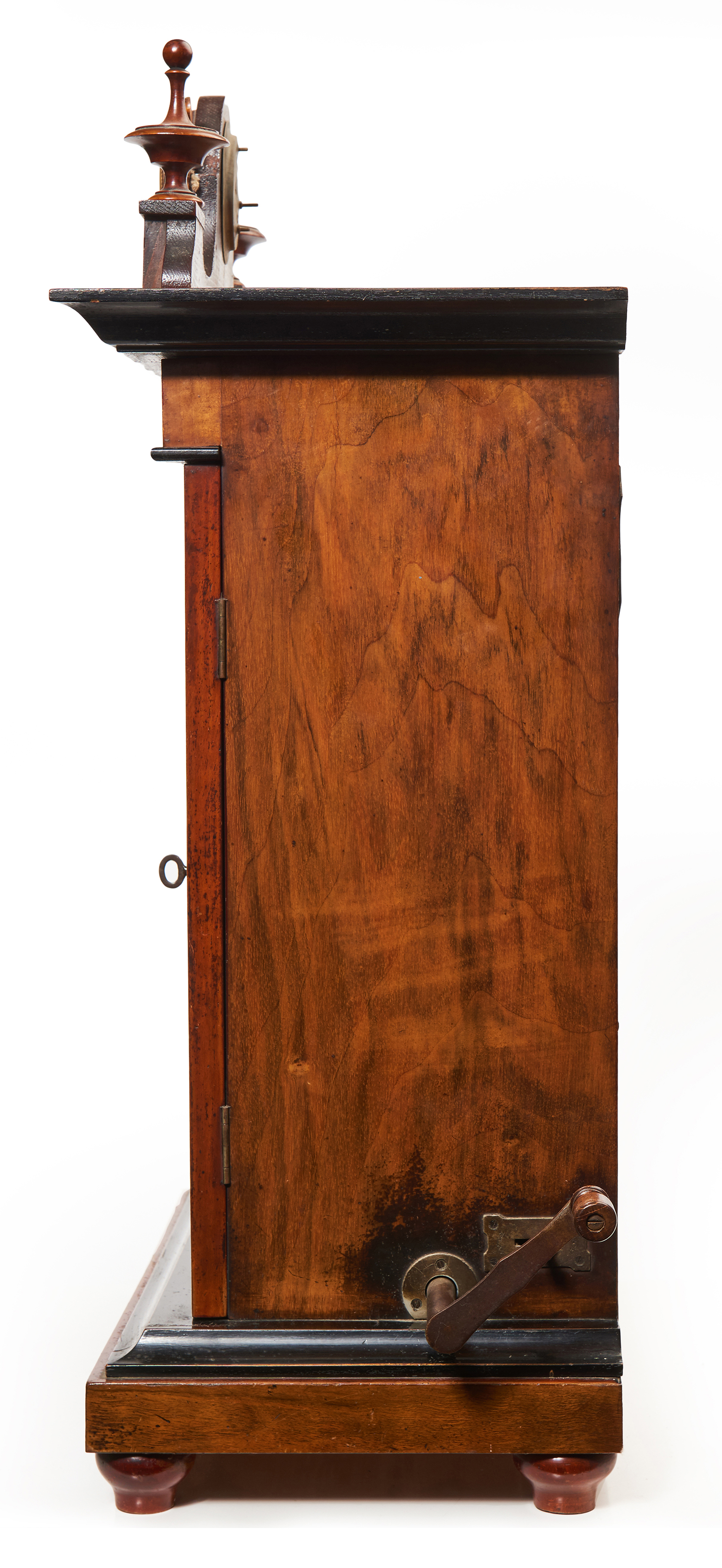 Walnut 9 inch disc playing in upright cabinet. Crest with two finials and clock between in a walnut case with two opening doors. Colloquially known as a 'Smokers Cabinet'