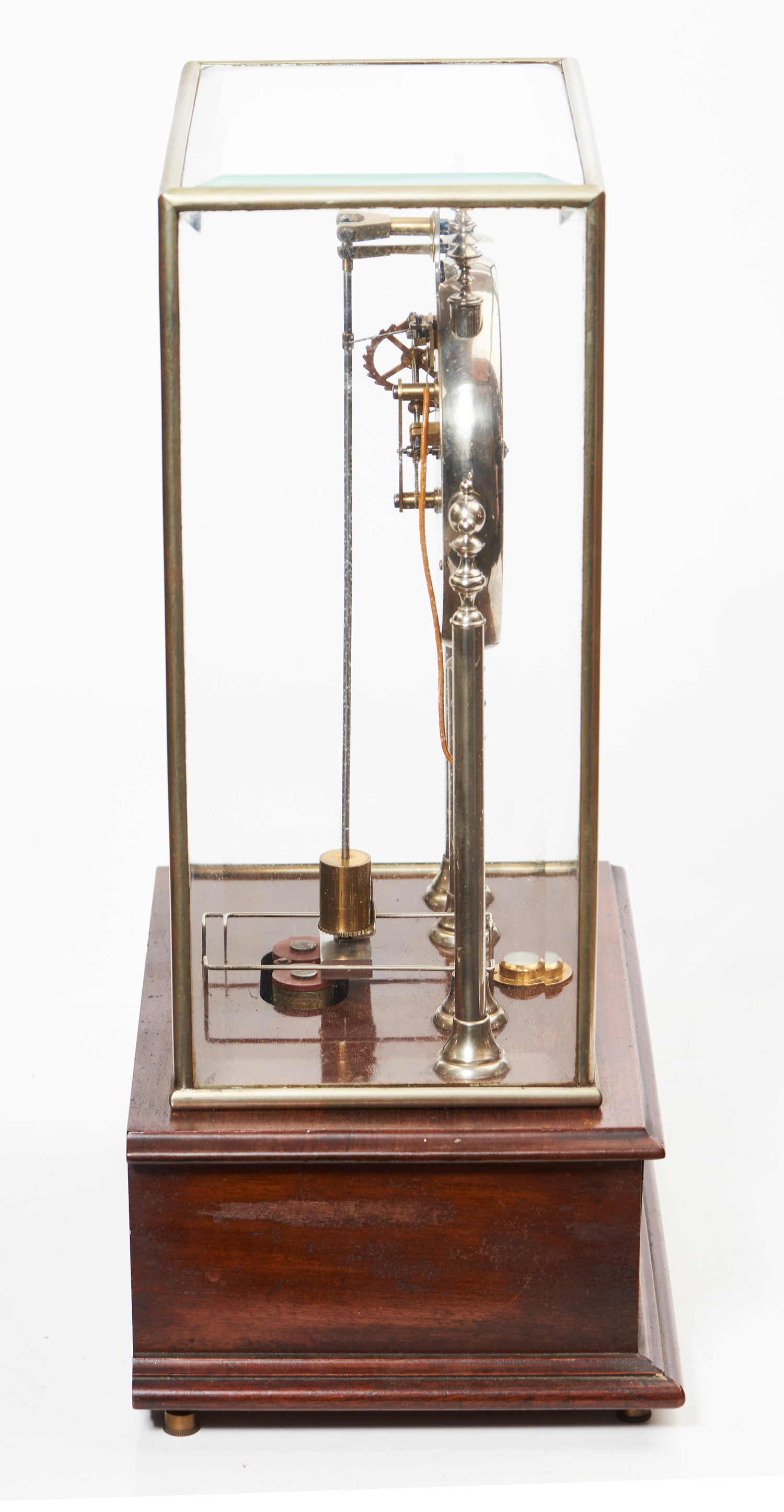 The five glass case, with a nickel plated surround, and a mirror to rear panel. The nickel plated pillars enclosing a white enamel dial with Arabic numerals. Battery compartment in walnut base