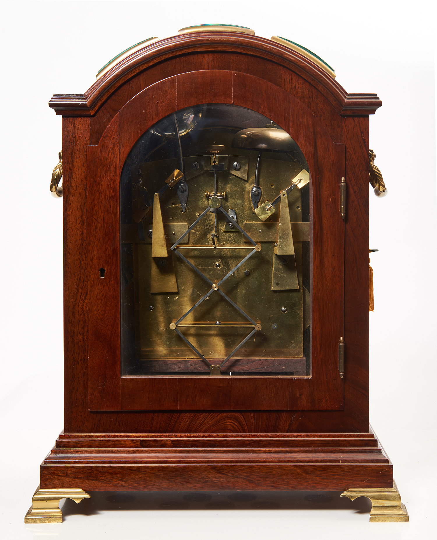 The break arch case with three brass trimmed rectangular glass panels set into the top of the arch. Circular cast brass bezel with brass inset panels above the dial and two brass inset panels below dial. Brass carrying handles to each side above brass bound glass side panels. The moulded base on brass bracket feet. The circular silvered brass dial with seconds dial above centre arbour having engraved Roman numerals. The three train fusee movement with deadbeat escapement, maintaining power is of eight day duration, quarter chiming on eight bells with two tunes selected at rear. With rhomboid pendulum
