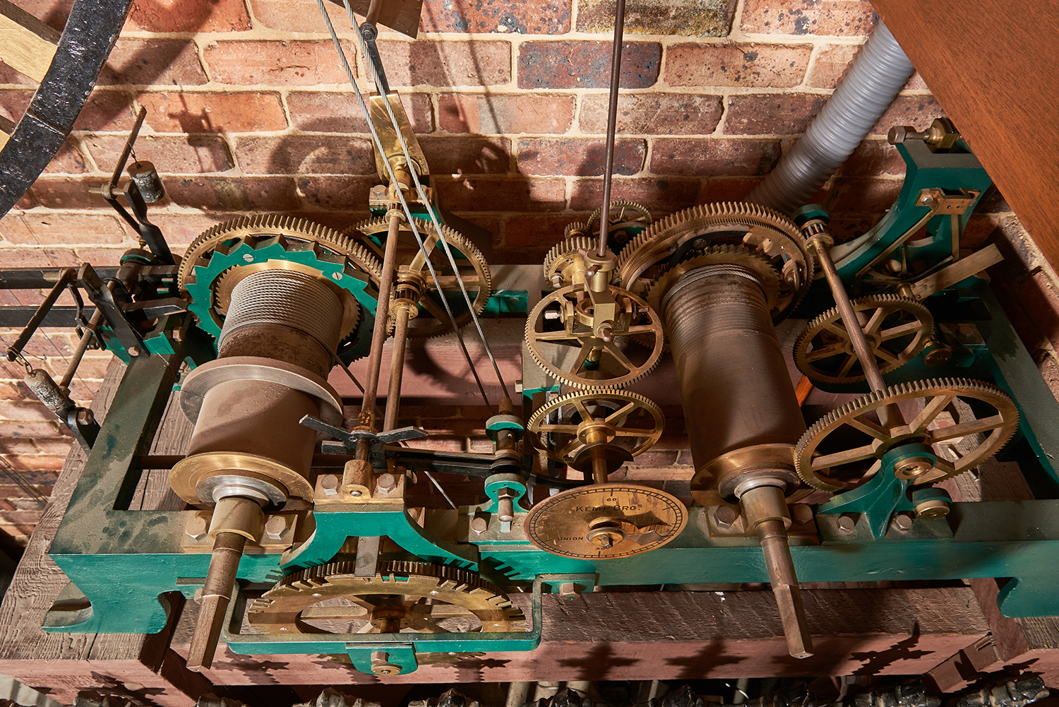 The cast iron dial skeletonised with gilt finished steel hands, Roman numerals and an ivy leaf design pierced centre. Flatbed two train with double three legged gravity escapement with counterwheel control of strike with pump action on hour for one bell and night lock out of bells with pump out of both bells. Pendulum bob 240lb with wood rod.