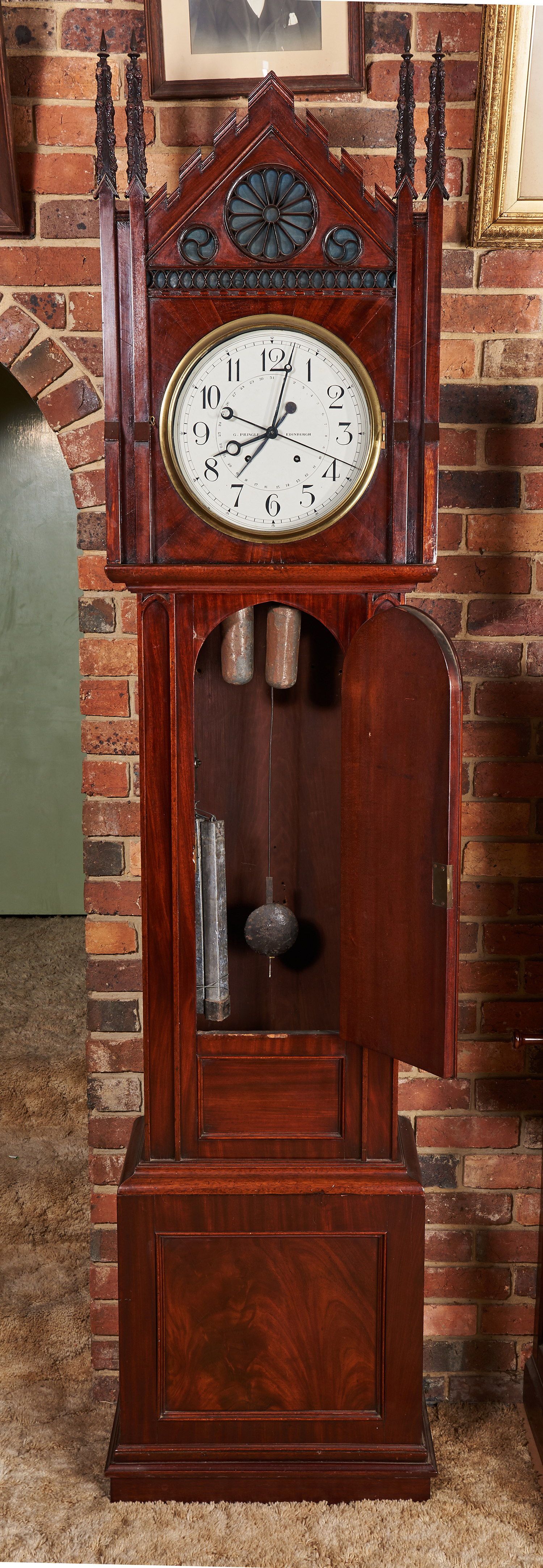 The mahogany, Gothic style case with crenelated top to hood with arched apertures to each side of hood. The glazed hood door flanked by turned columns above trunk with full length door, dropping to ogee moulded shoulders above base. A 35.5 cm diameter circular painted dial, with centre sweep seconds and calendar work, signed G. Pringle- Edinburgh. An eight day, weight driven movement with a dead beat escapement. The Black Forest organ movement complete with wooded pipes. Full length opening trunk door on plinth base