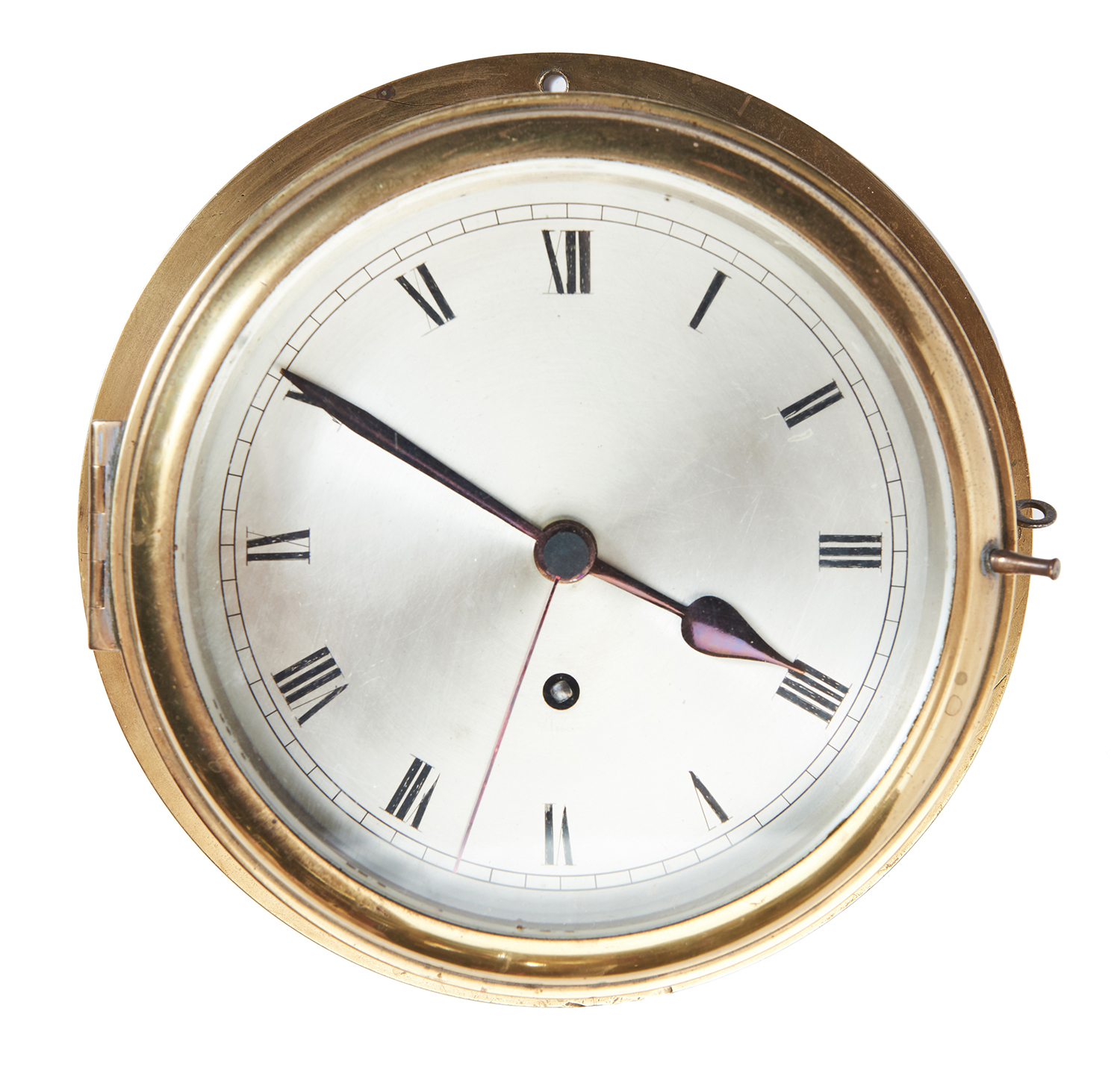 The circular dial with Roman numerals, in a brass surround. Fusee movement