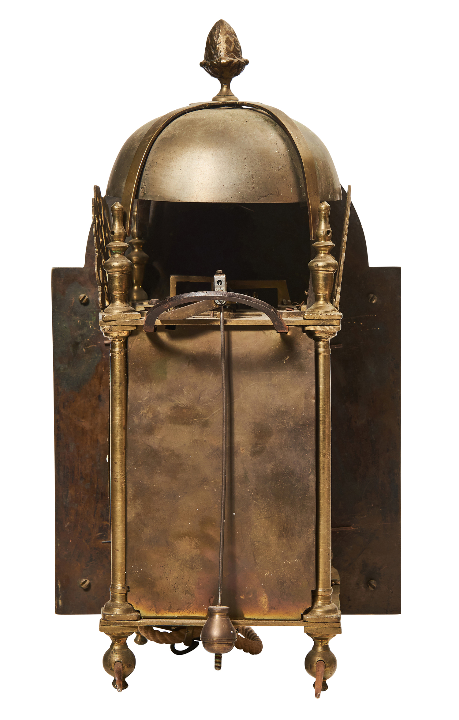 The original Turkish market dial with well finished scroll leaf spandrels, pierced steel hands and signed Isaac Rogers- London on a boss in the arch. Acorn finial and top mounted bell, with doors to side and plate to back. Thirty hour weight driven movement with hour striking on bell. The posted movement with short bob verge escapement and outside countwheel