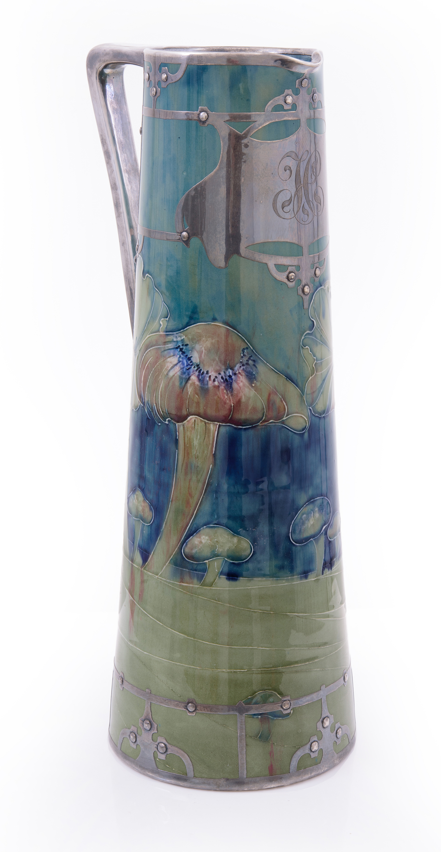 tapering in form, green and midnight blue ground with a repeating toadstool design. The handle, base and upper body are applied with electroplated silver overlay in the Liberty manner, hand signed 'W Moorcroft, Shreve & Company, San Francisco', also stamped with registration number 363 to base. 41cm high