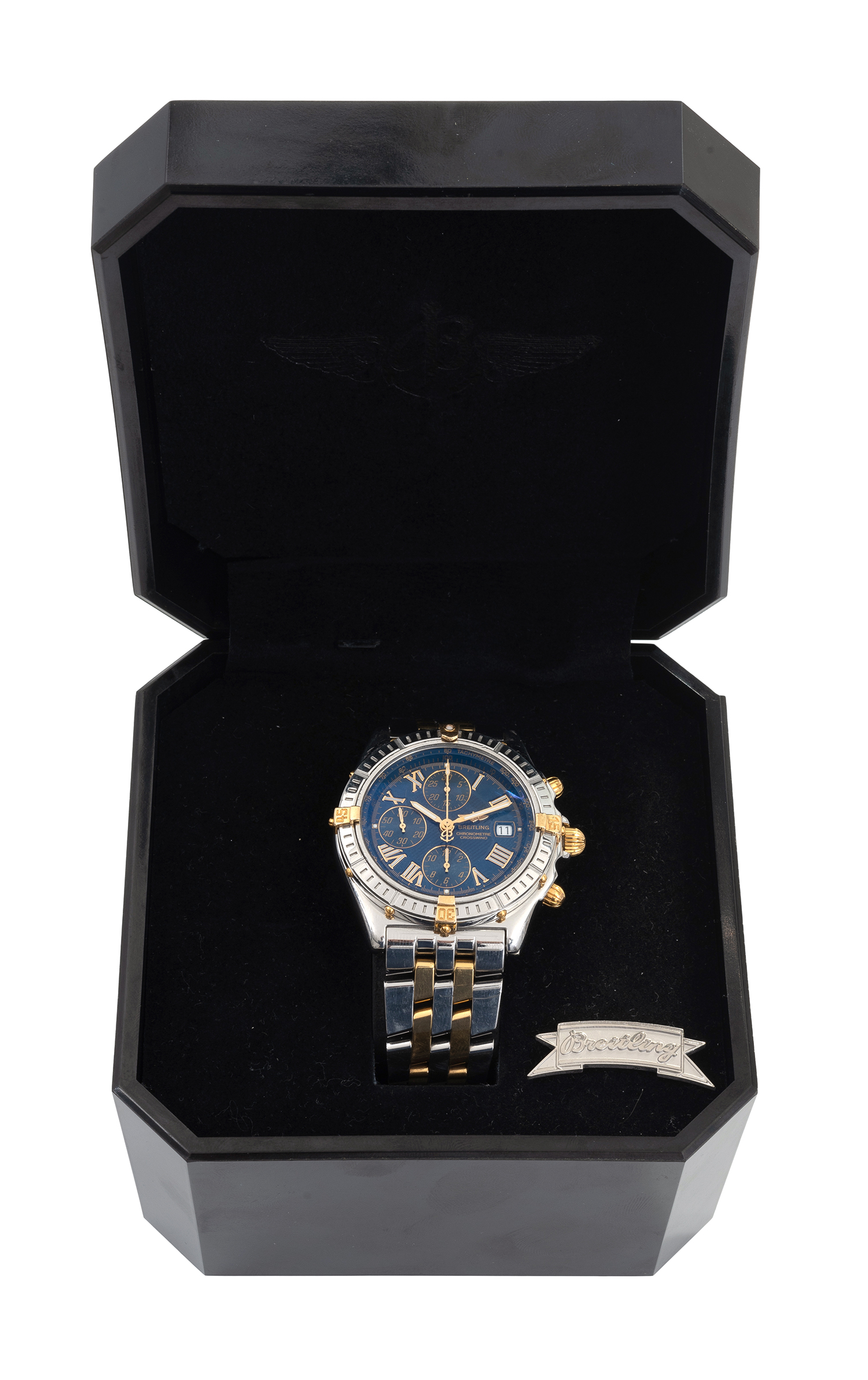 Automatic movement, circular navy blue dial with Roman numerals, date aperture at three, signed case ,dial and movement, stainless steel case with gold detail and conforming bracelet bands, reference number B1335512.C510, serial number 280542, 40mm diameter, boxed with papers.