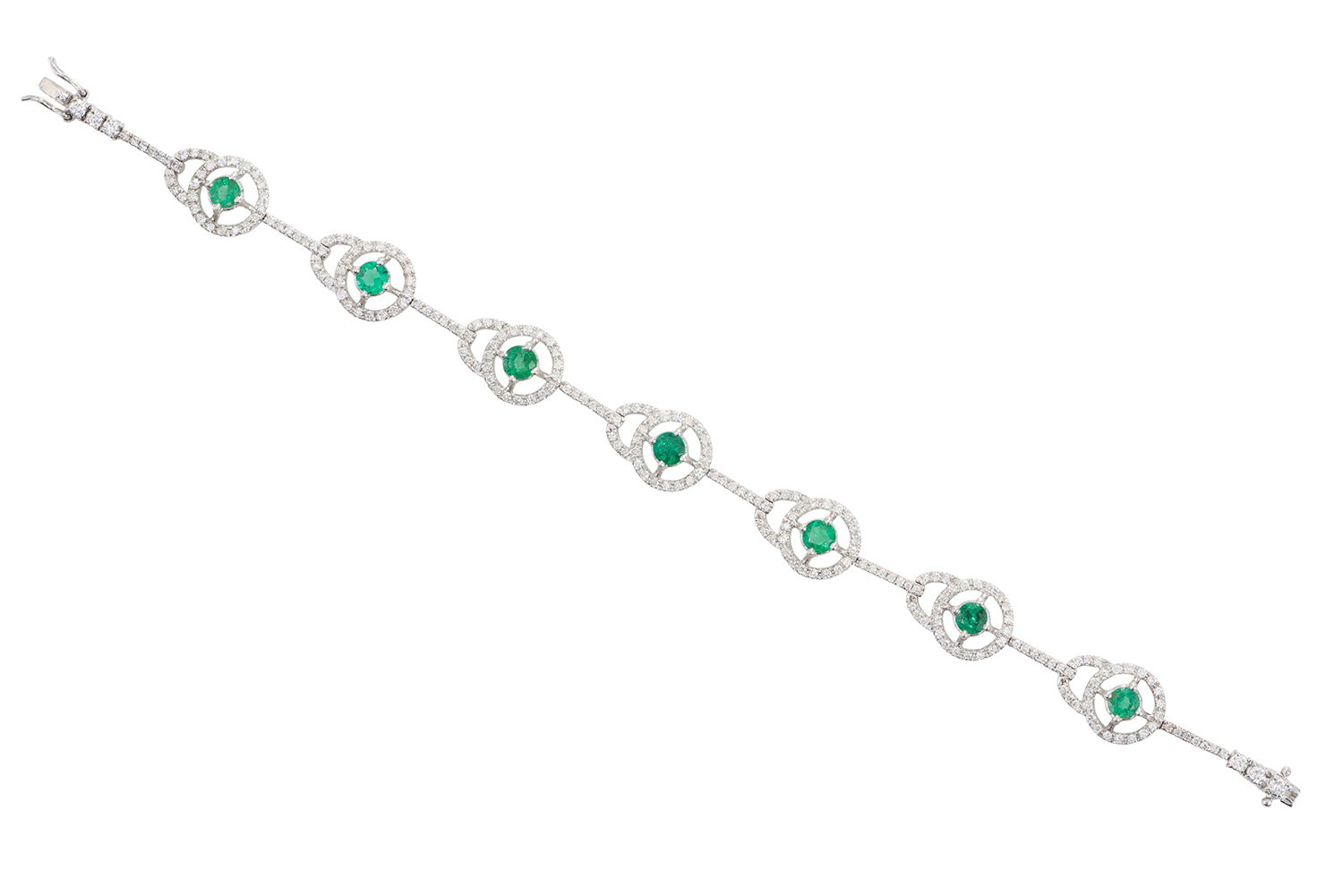 The bracelet set with nine emeralds totalling 2.06cts, within circular diamond panels totalling 1.19cts, with a pair of earrings of conforming design, all in 18ct white gold, bracelet length 180mm.