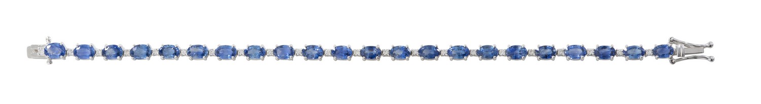 Comprising twenty two oval cut sapphires totalling 14.40cts, interspaced with twenty two round brilliant cut diamonds, in 18ct white gold, total length 180mm.