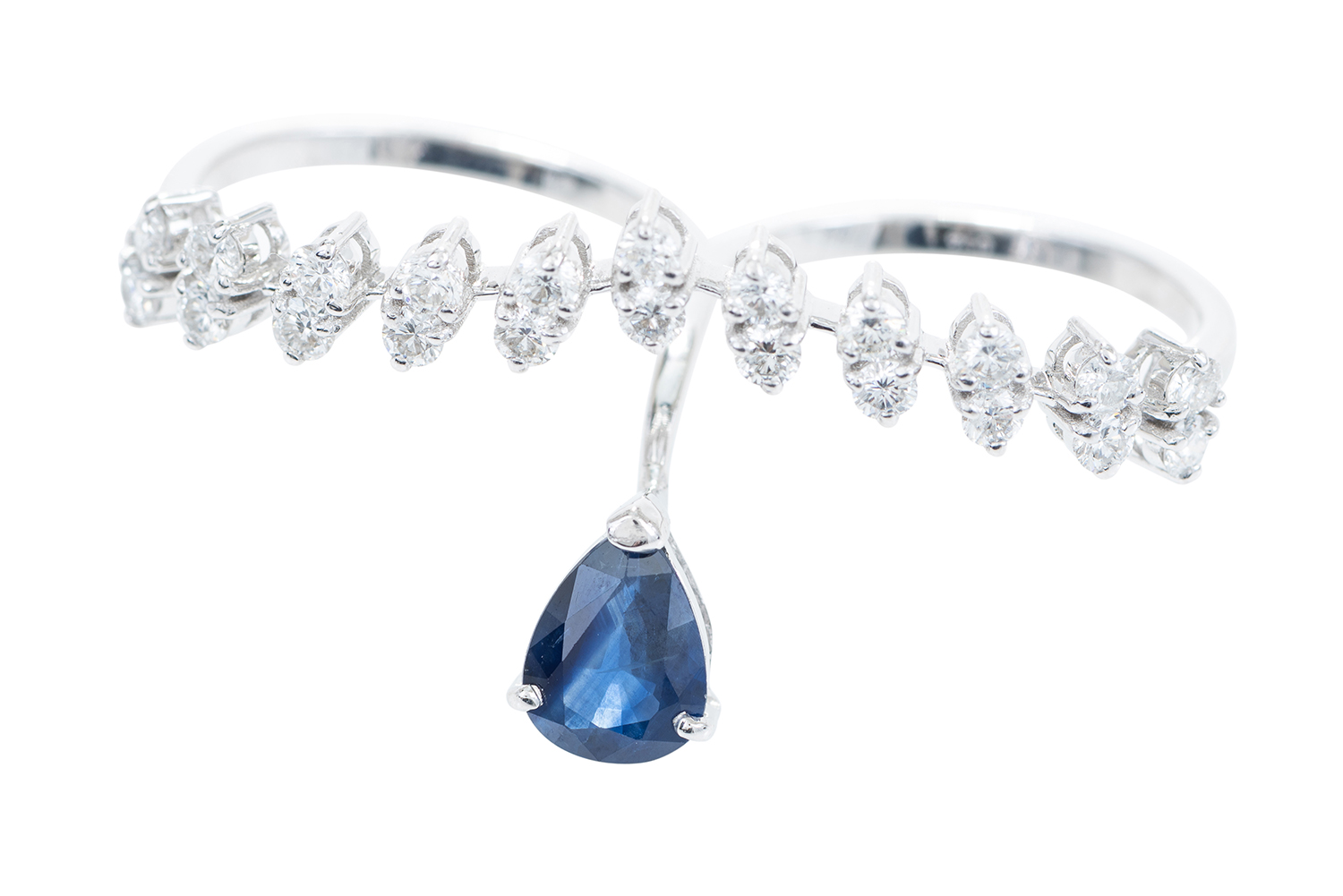 A SAPPHIRE AND DIAMOND TWO FINGER RING- Set with a pear cut sapphire and round brilliant cut diamonds totalling 1.05cts, mounted in 18ct white gold, ring size P.