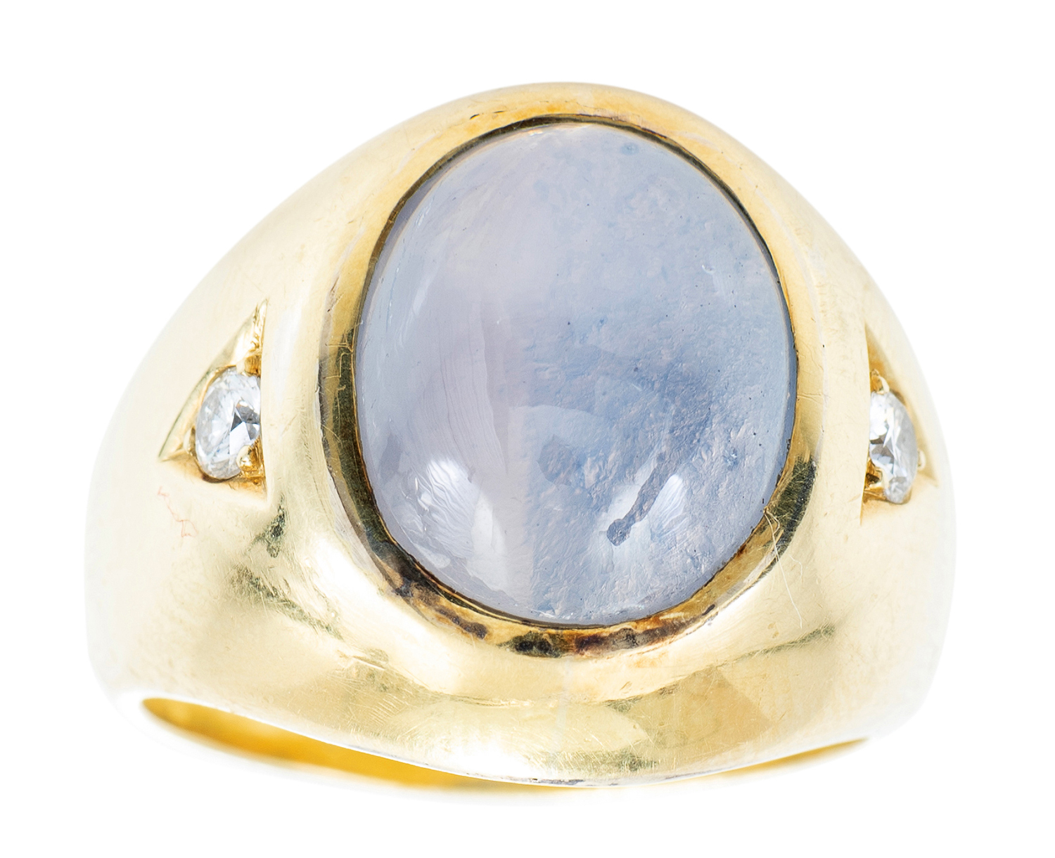 The sapphire cut en cabochon of 13.00cts, with round brilliant cut diamonds to the shoulders totalling 0.25cts, mounted in 18ct gold, ring size T.