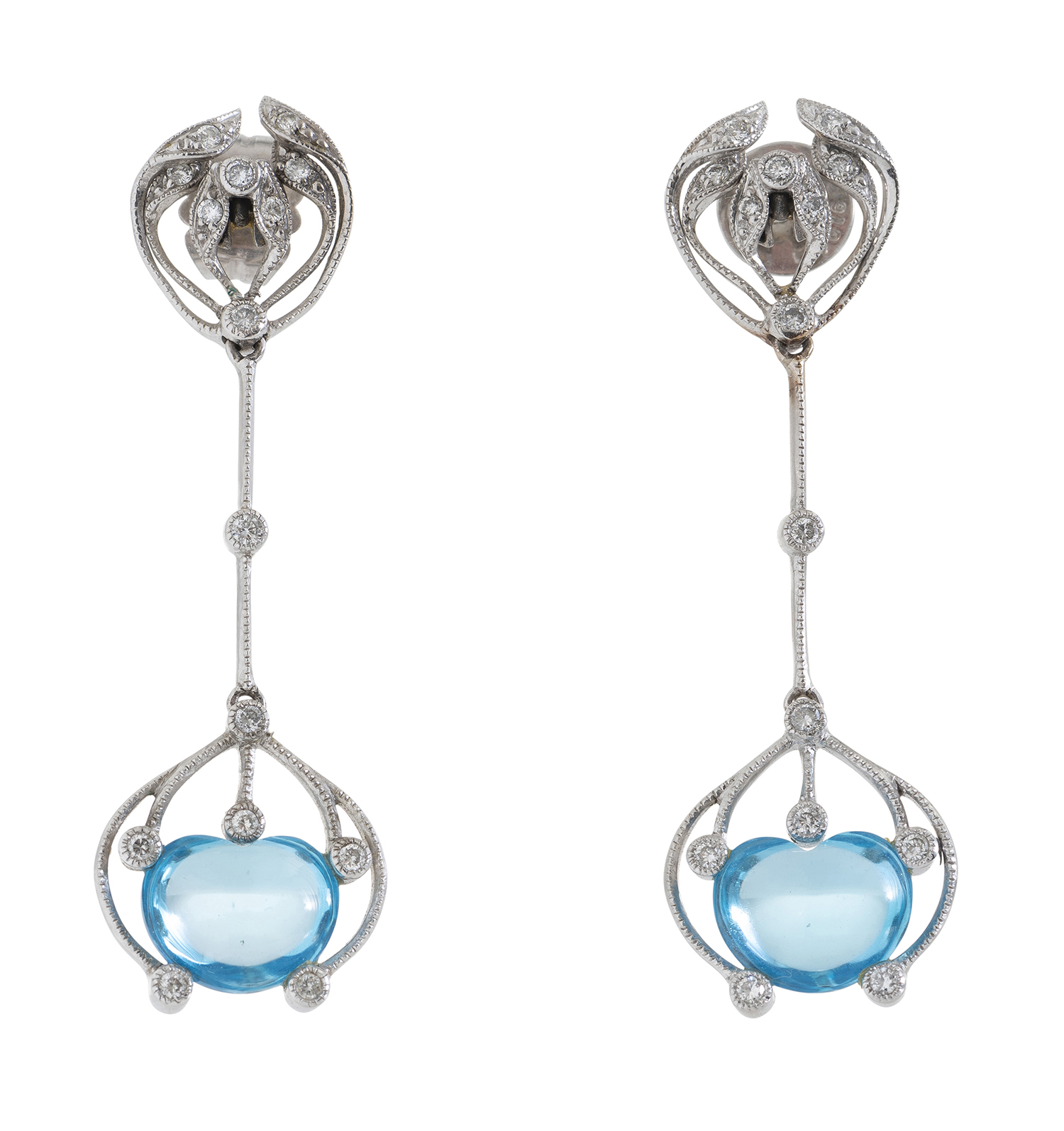 The finely crafted Art Nouveau style drop pendant set with diamonds and a cabochon cut topaz, with conforming earrings, all mounted in 18ct white gold.