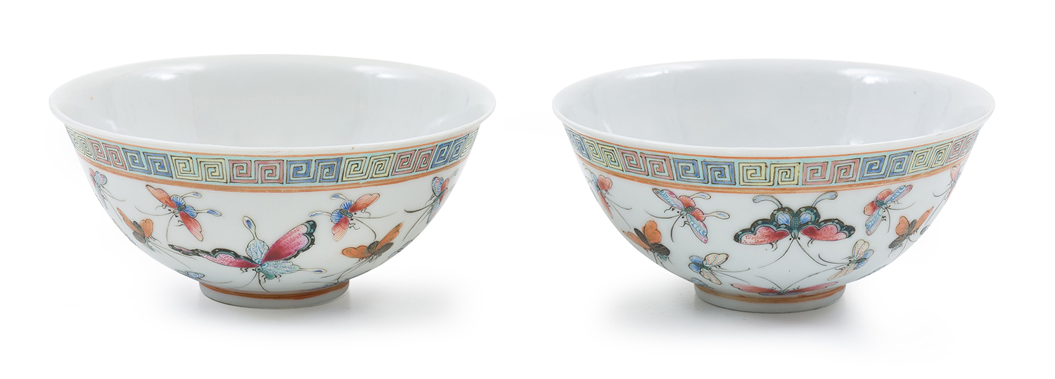Decorated with different butterflies in flight in overglaze famille rose enamels to the exterior, beneath a keyfret border, the interior with iron red and gilt decoration of five bats surrounding a Shou character. Six character iron red Guangxu mark to the base
