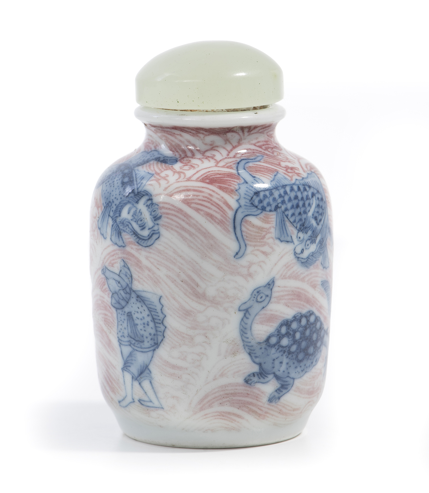 Finely decorated with eight mythical sea creatures in underglaze-blue against a copper-red field of waves. Later celadon jade stopper.