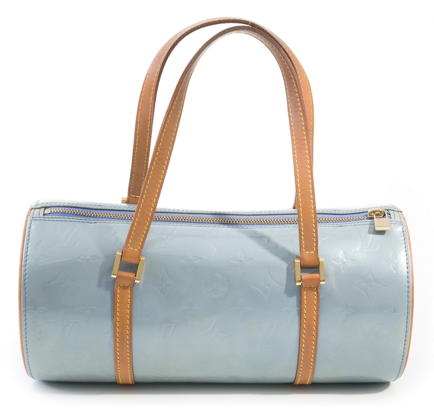 Styled in grey vernis leather with tan leather trim and gold metal hardware, M91130, 30 x 15cm