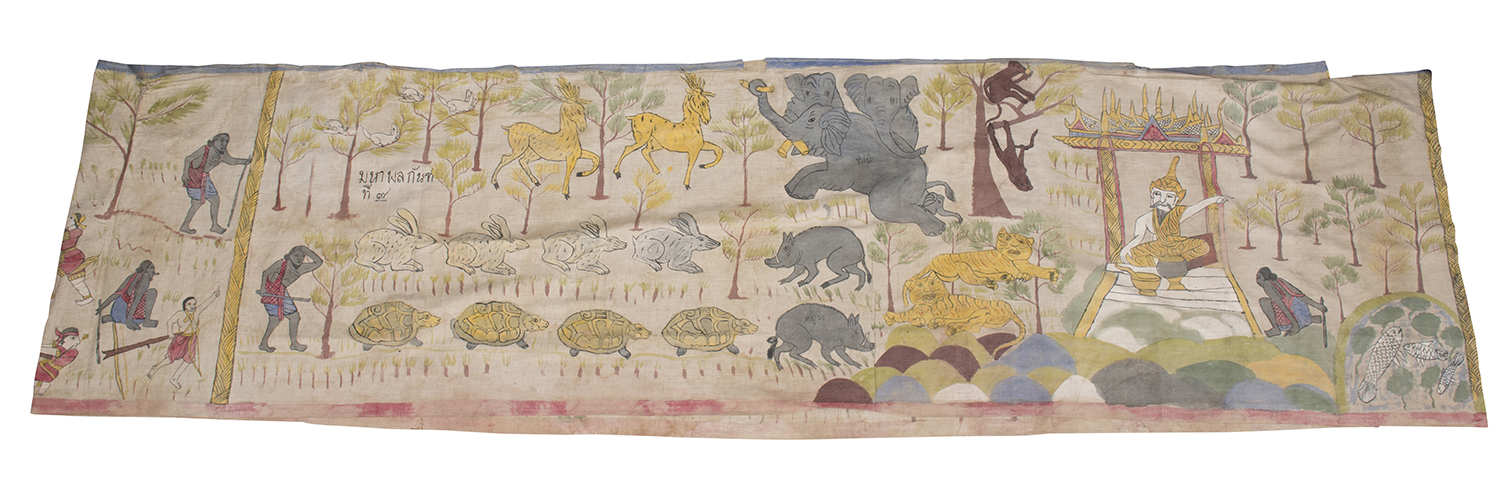 The wide temple banner depicting a forest scene with zoomorphic figures, humans including archers engaged in warfare, a royal figure in a pavillion, forest birds and animals including deer, tigers and elephants, some figures inscribed with Thai script, all painted in polychrome pigments on handloomed cotton.