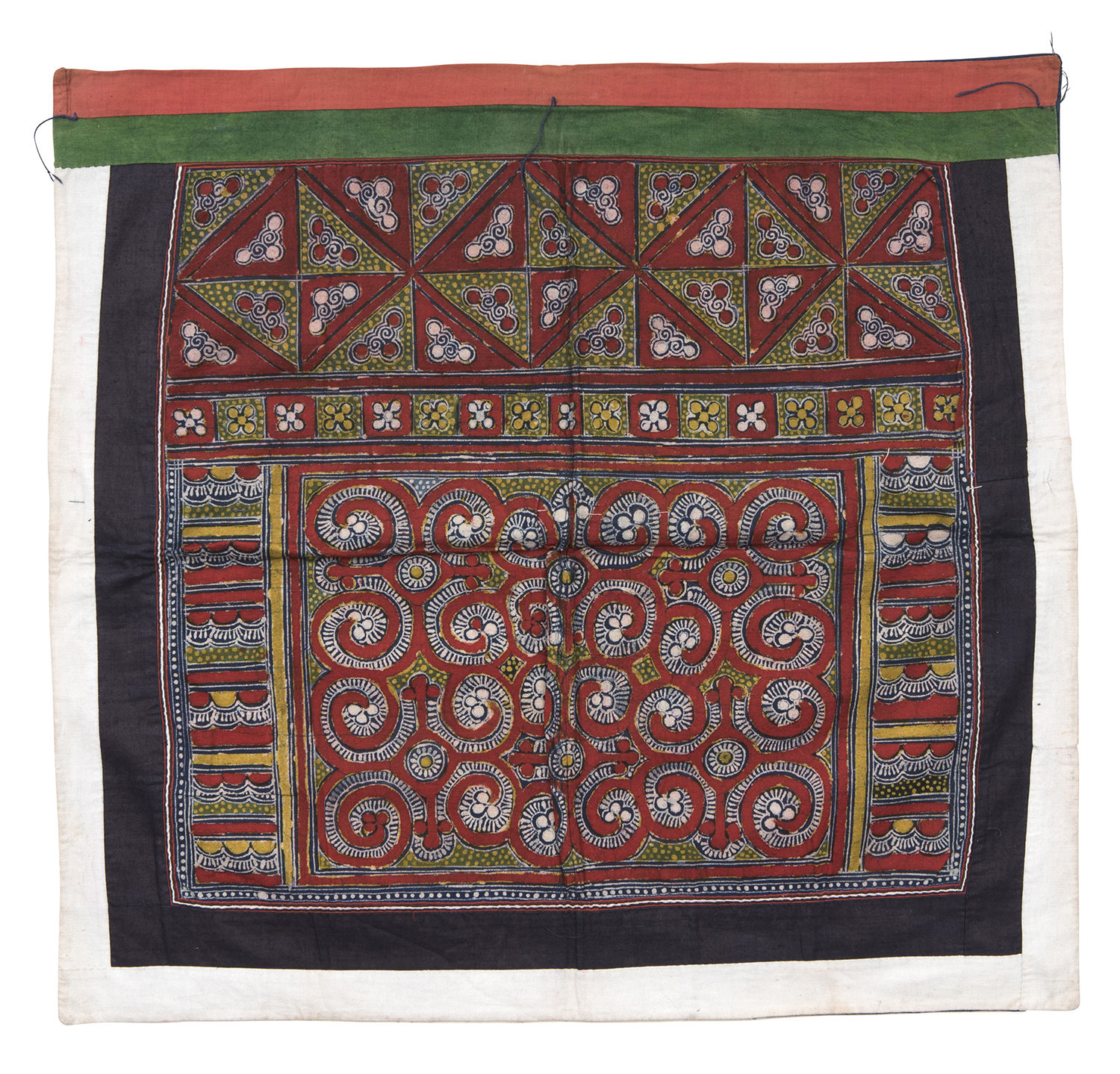 One panel of three colour batik with curvilinear and geometric designs in red, blue and yellow. Another panel with supplementary weft brocade geometric designs set in beaten indigo surround. Another panel with intricate multicolour floral embroidery. Two panels with intricate crosstitch geometric designs. A complete apron with supplimentary weft brocade geometric bands of decoration. Another apron of batik indigo, and the last of supplimentary weft brocade, geometric designs.