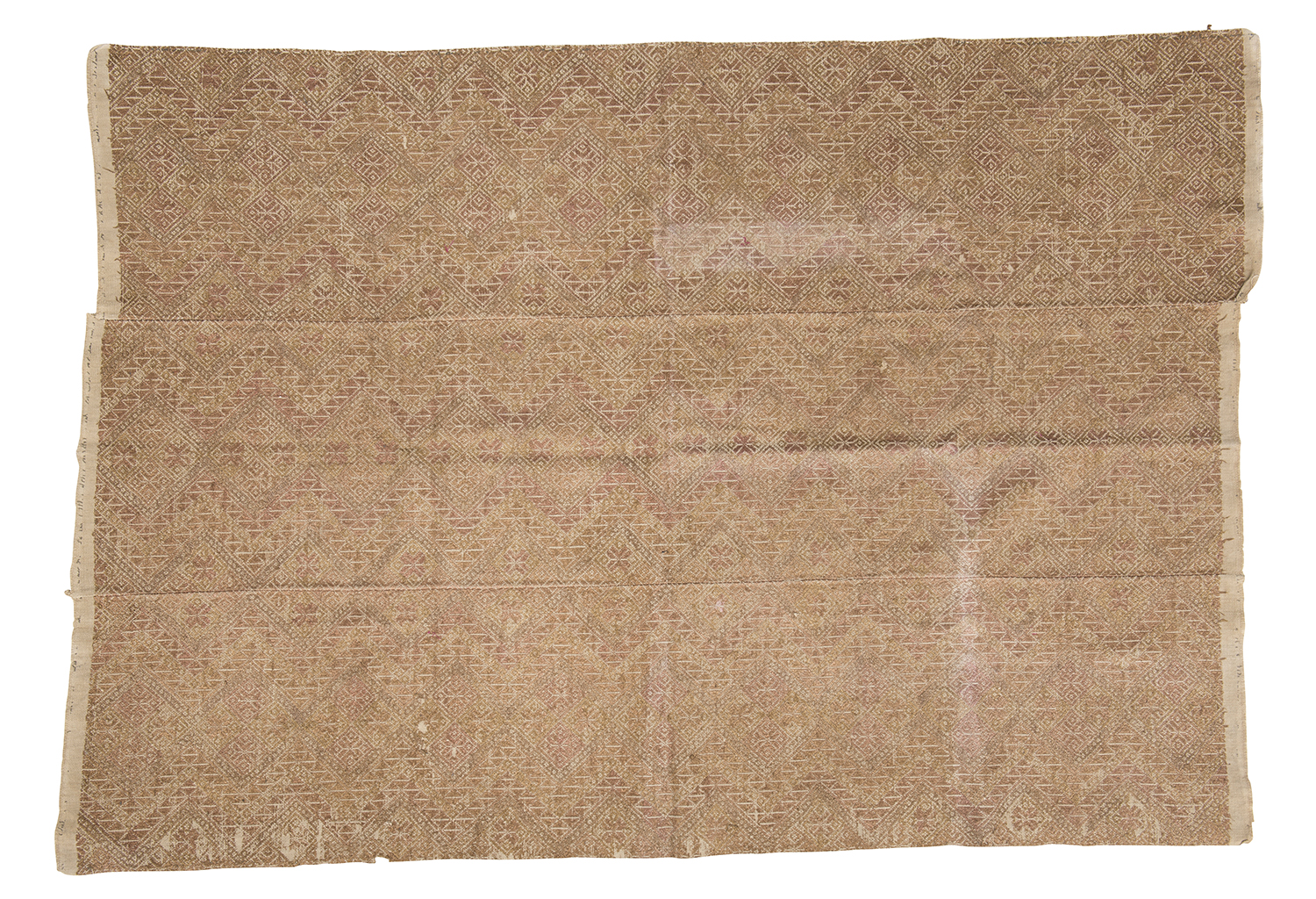 The group comprising three blankets of handwoven cotton structure, embroidered all over with silk gemoretric embroidery, one of the blankets bordered with indigo plain cotton surround.