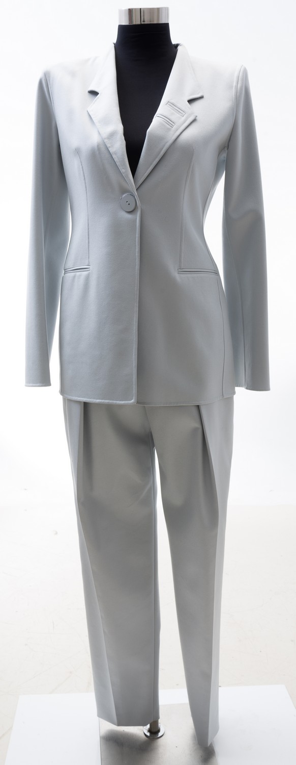 Comprised of trousers and jacket, styled in grey silk blend, both labelled size IT42.