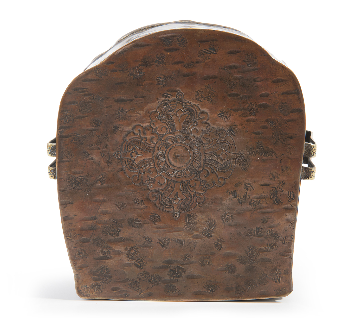 The gao beautifully decorated with a repousse depiction of Manjushri in silver alloy and brass to the front of the flame-mandorla-shaped box, with replaced later talismanic contents.