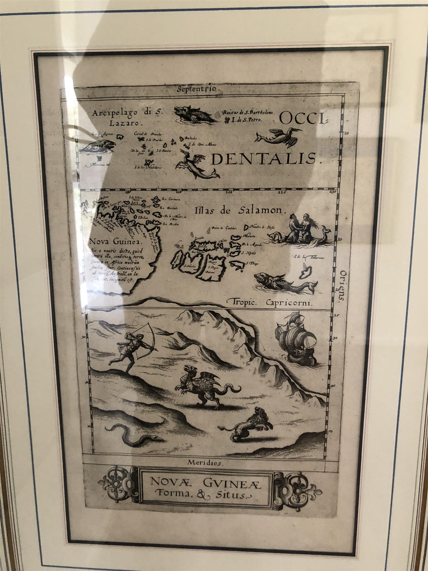 The rare uncoloured map of New Guinea, is recognised as the first printed map of Australia. The whole of the lower half of the map depicts an entirely imaginary northern coast of Australia depicting of a native man with bow and arrow attacking a gryphon, a snake and a lion.