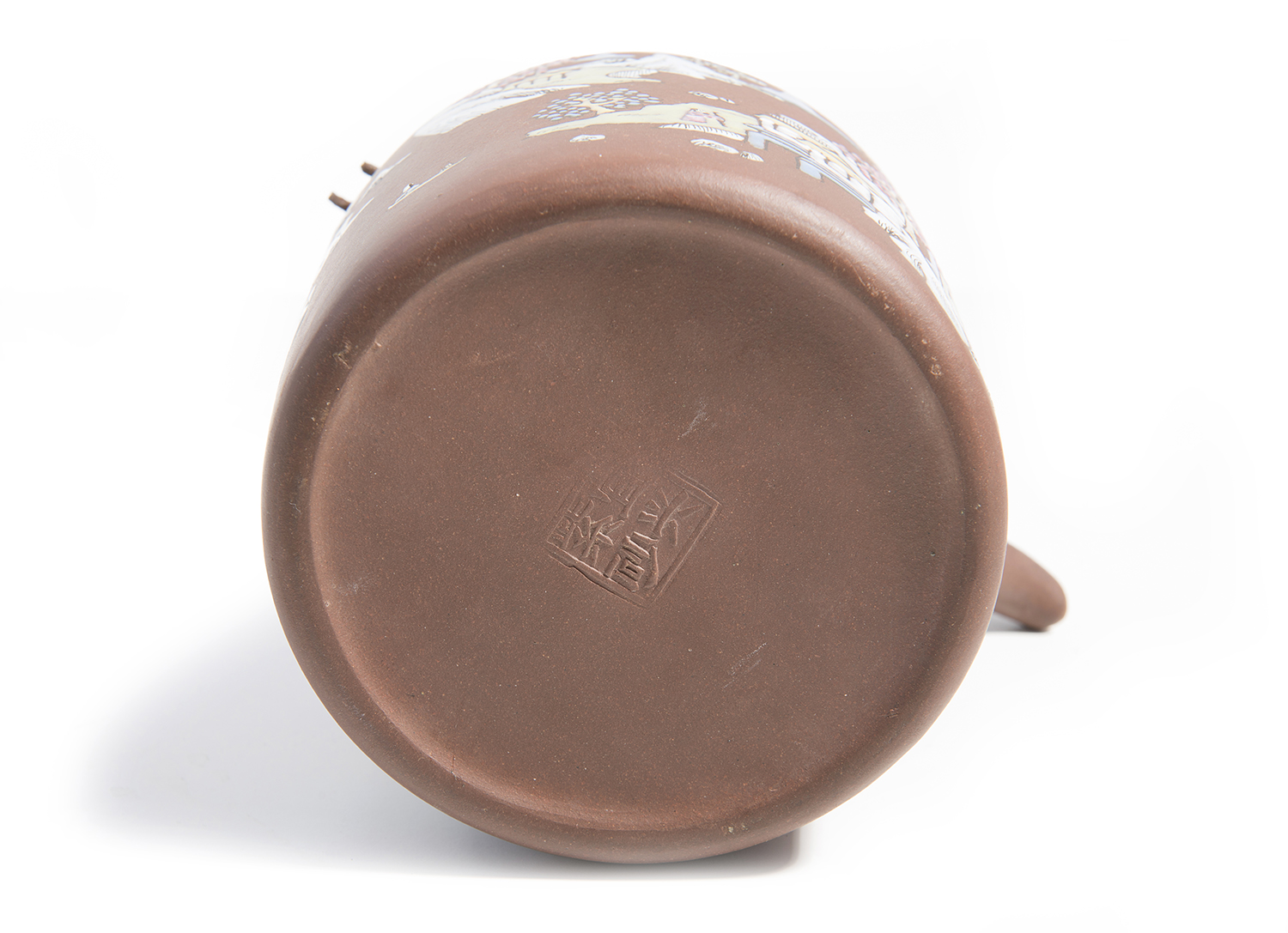 The teapot of cylindrical form, potted from a dark purplish-brown clay, decorated to the sides and lid with houses, pavillions and people amongst mountainous forest landscapes in enamels of the fencai/famille rose palette. Marked Yixing zisha to the base.