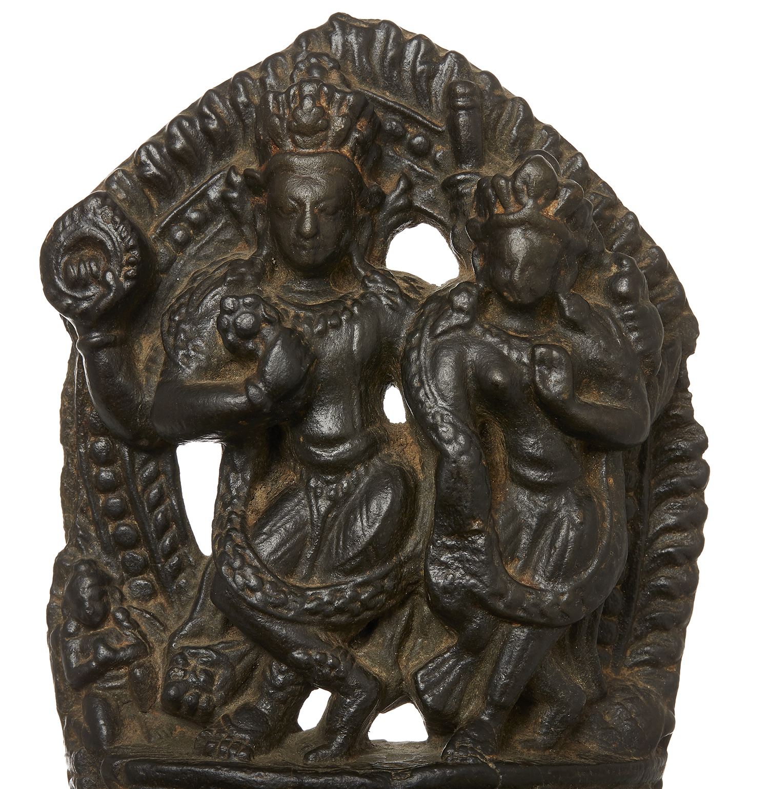 A NEPALESE BLACK STONE SCULPTURE OF VISHNU WITH LAKSHMI